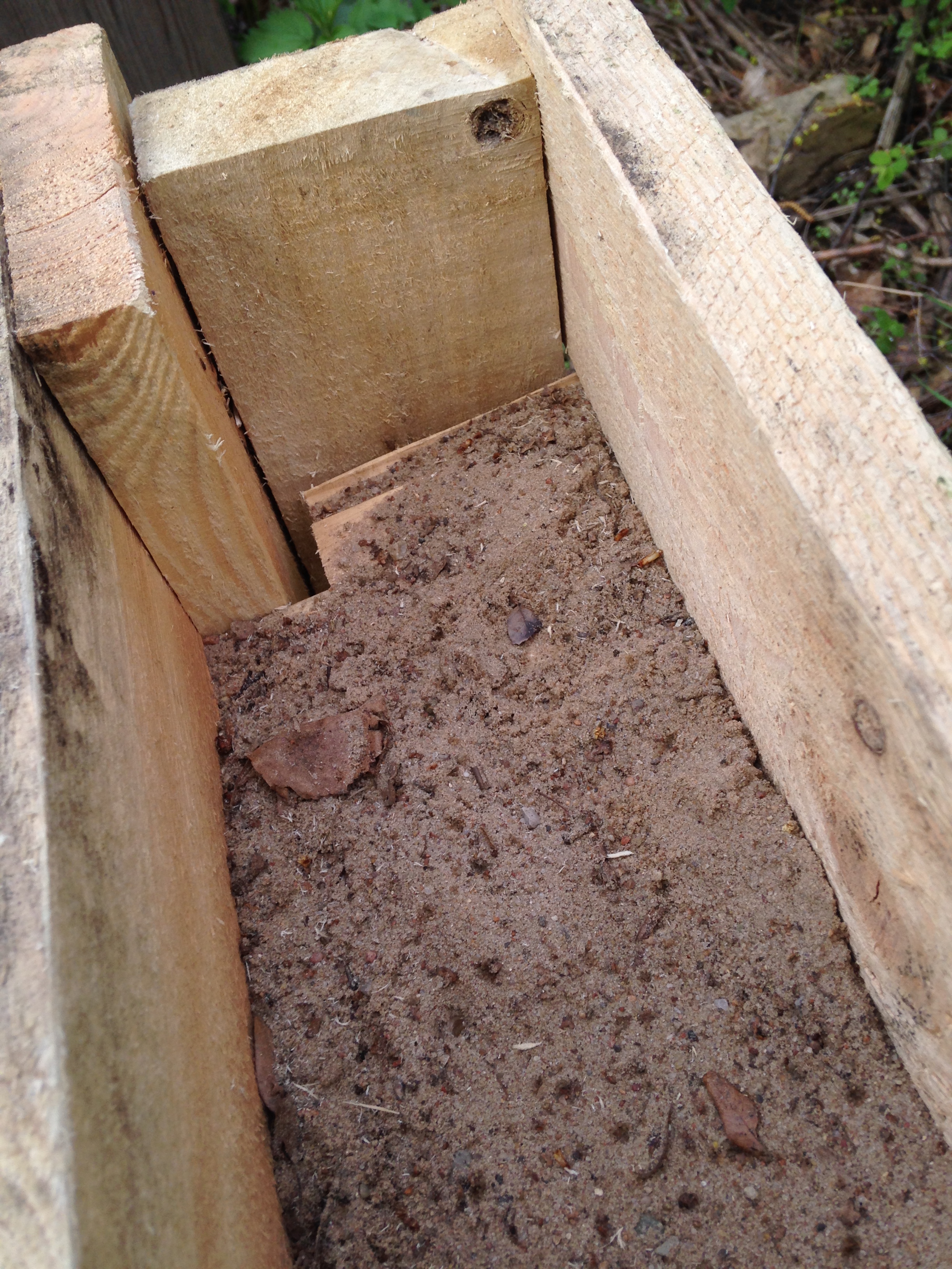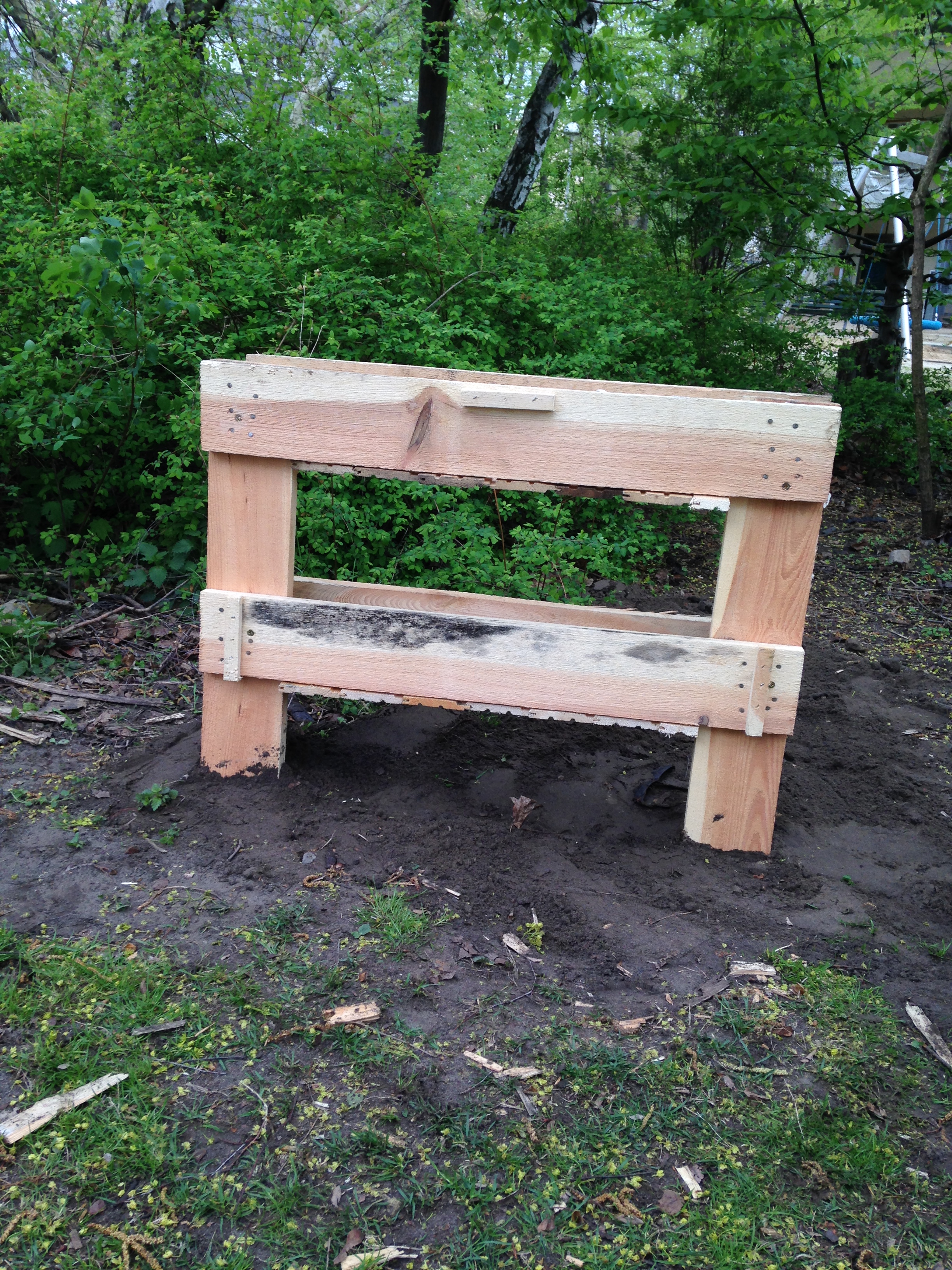 letzte woche haben wir die paletten zusammengeschraubt und bodenbretter für 2 etagen angeschraubt. da unser etagenbeet auf erdigem grund und auch nicht an einer wand stehen sollte, mussten wir es eingraben. aus gründen der stabilität ist dabei die dritte, unterste etage draufgegangen.