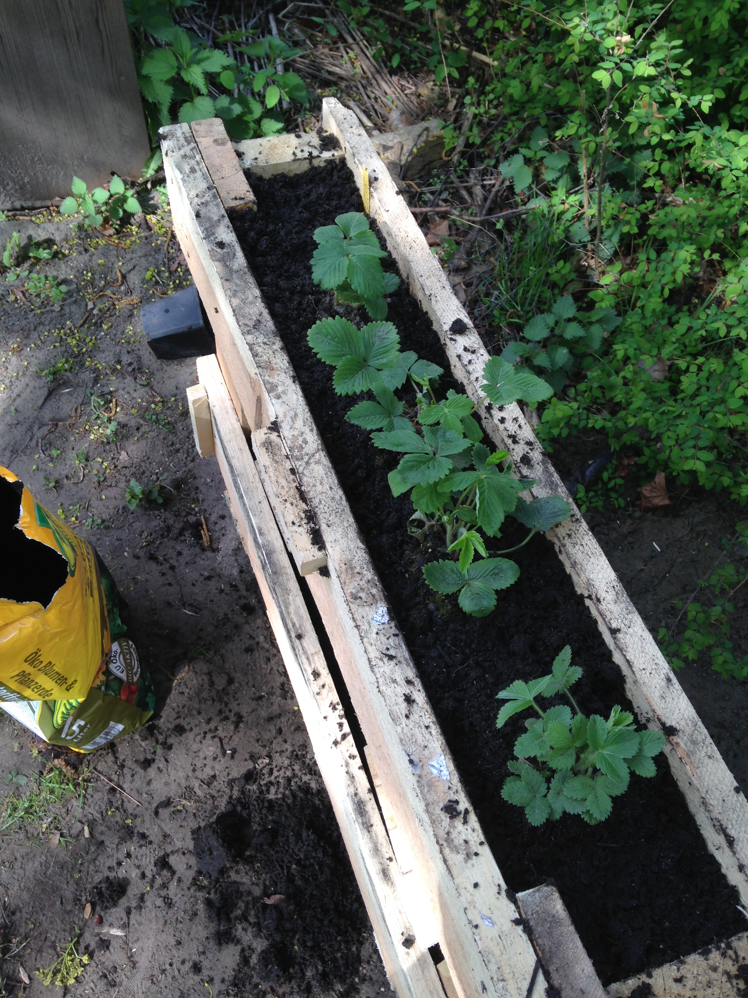 zwischen die erdbeeren habe ich jeweils eine knoblauchzehe gesteckt, ausserdem stroh zwischen den pflanzen verteilt – beides gegen ungeziefer.
