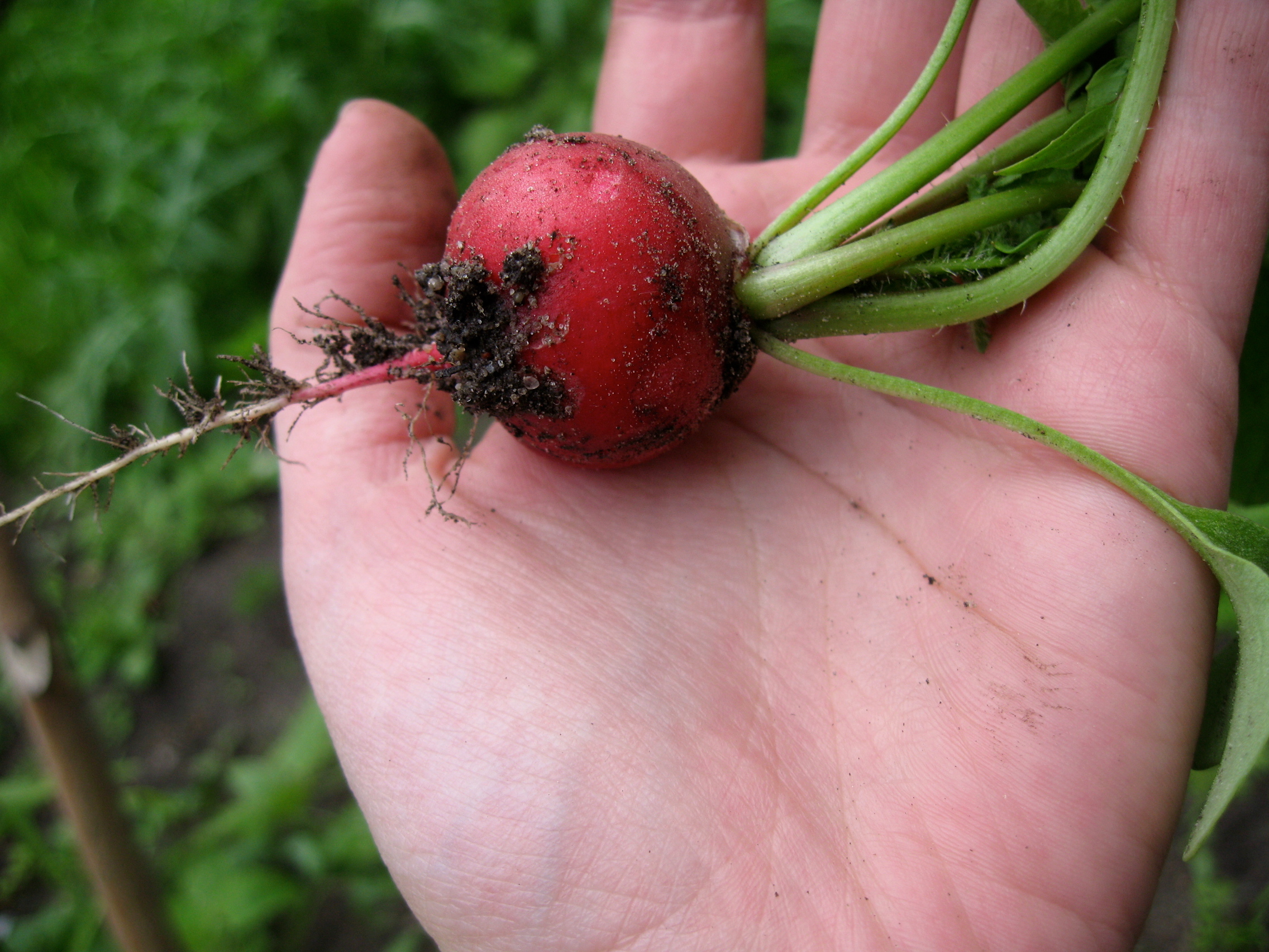 und das „aufräumen“ des beetes wurde belohnt: mit der ersten handvoll radieschen, ordentlich angeknabbert bereits von kleineren zeitgenossen, scharf und frisch im geschmack. woraufhin der kleine begleiter gleich möhren und den frisch eingepflanzten kürbis aus der erde riss: „aber ich weiss doch gar nicht, was das ist! ich muss doch gucken!“ wir haben geguckt, erzählt, wer lieber unter, wer lieber über der erde wächst und wieder in die erde gesetzt. und ein paar beschwichtigende worte hinterher geschickt.