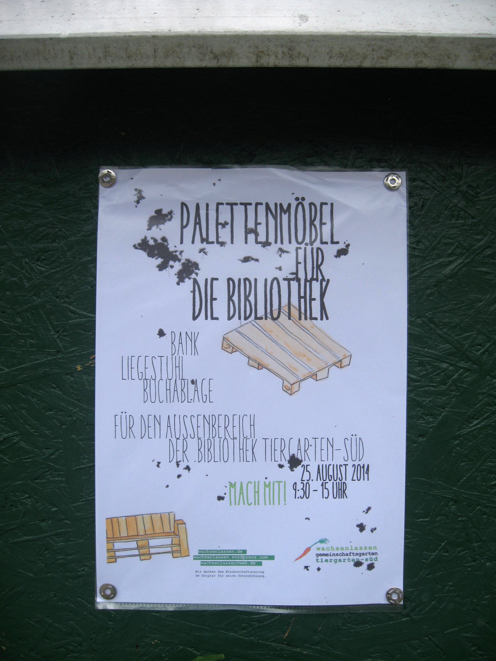 für die bibliothek tiergarten-süd werden paletten-möbel gebaut! genauer gesagt für den aussenbereich vor der bibliothek, damit dort bald auf liegen und bänken geschmökert und über (urbane) gärten gefachsimpelt werden kann.