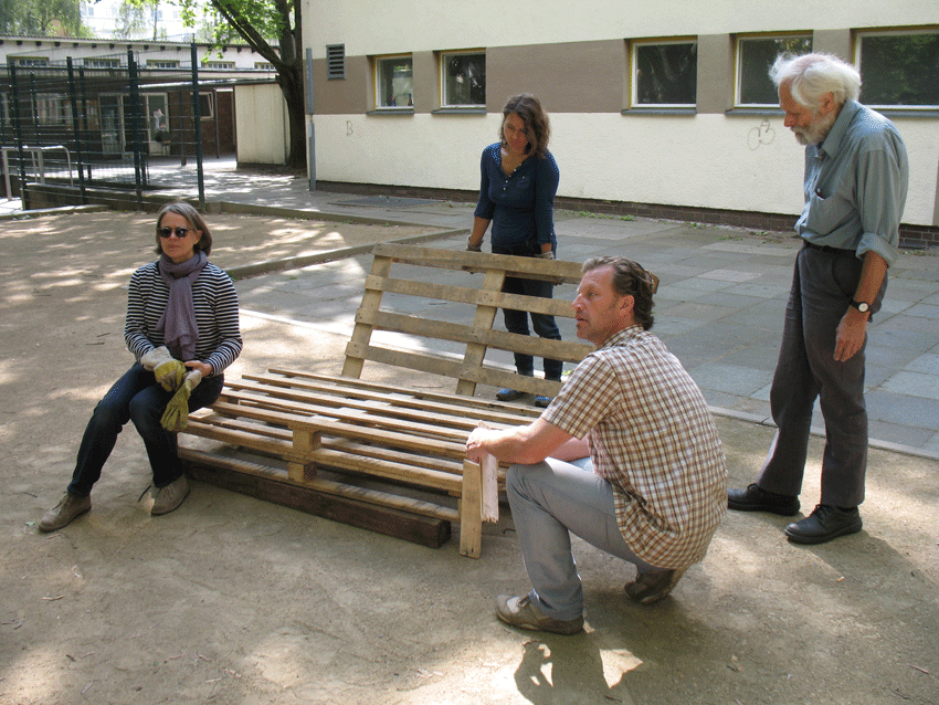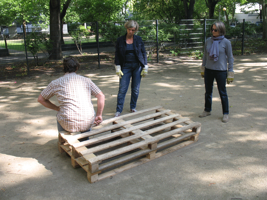 Spontan fiel irgendwann die Entscheidung, ein, zwei Gartenmöbel aus Paletten für den Aussenbereich unserer Stadtteilbibliothek  zu bauen.