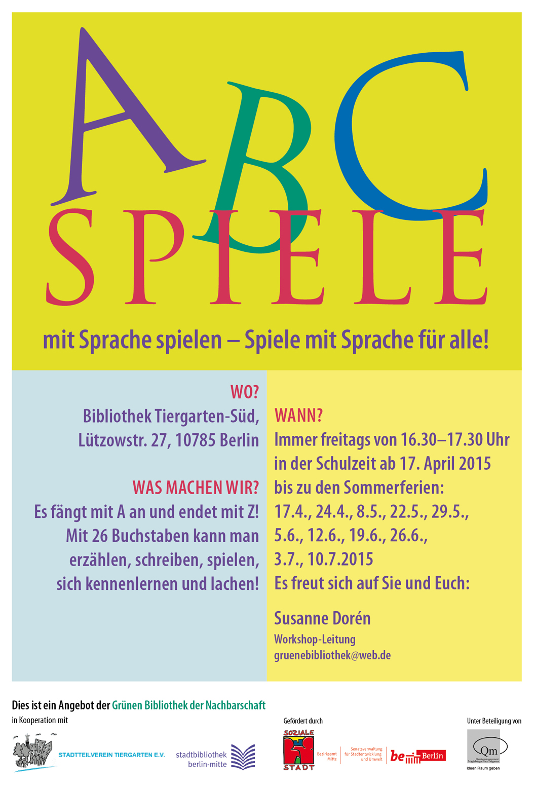 Am Freitag, den 17. April starten wieder die ABC-Spiele mit Susanne Dorén in den Räumen der Bibliothek Tiergarten-Süd.