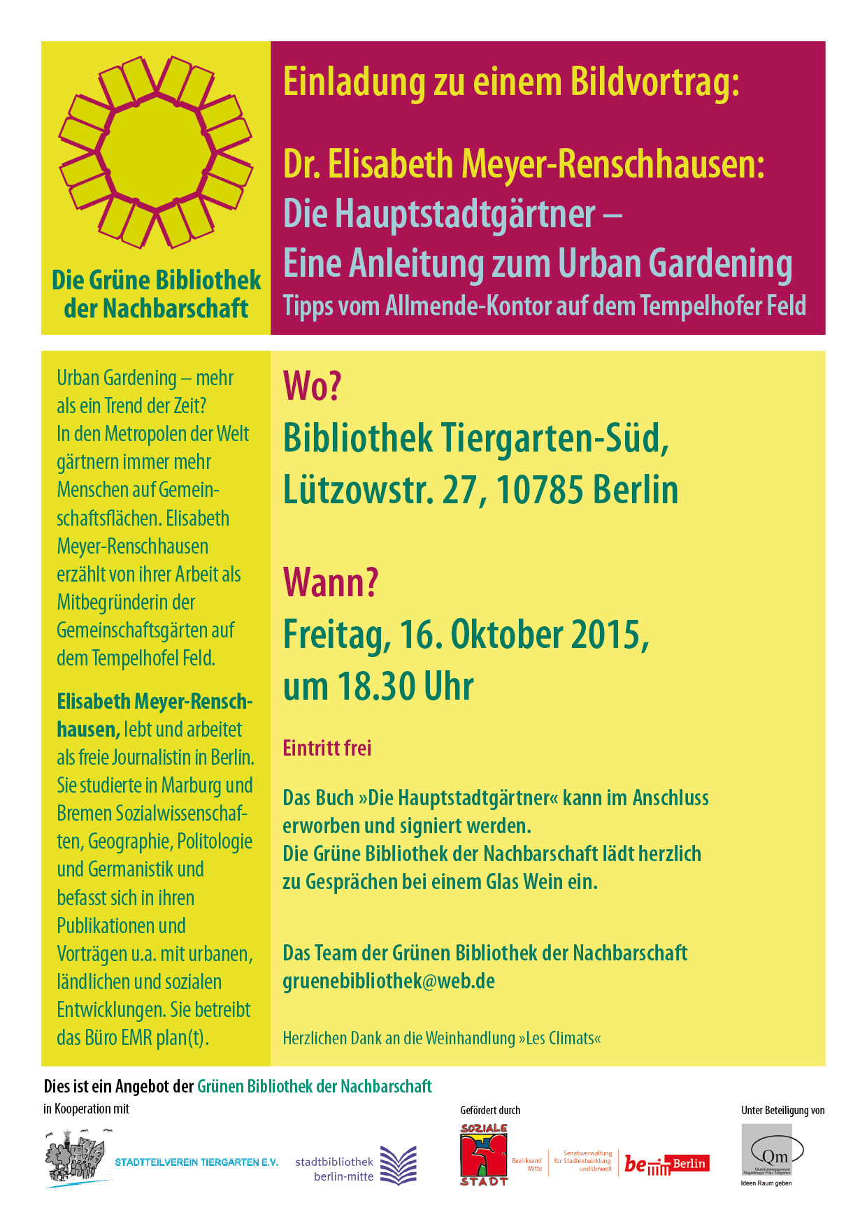 Veröffentlicht: Oktober 6, 2015 Abgelegt unter: Die Grüne Bibliothek | Tags: Bibliothek Tiergarten-Süd, Garten in der Stadt, Gemeinschaftsgarten, Gemeinschaftsgarten wachsenlassen, Grüne Bibliothek, Stadtgarten, Urbanes Gärtnern Hinterlasse einen KommentarWir freuen uns, zu einem Bildvortrag mit Frau Dr. Elisabeth Meyer-Renschhausen einladen zu dürfen: