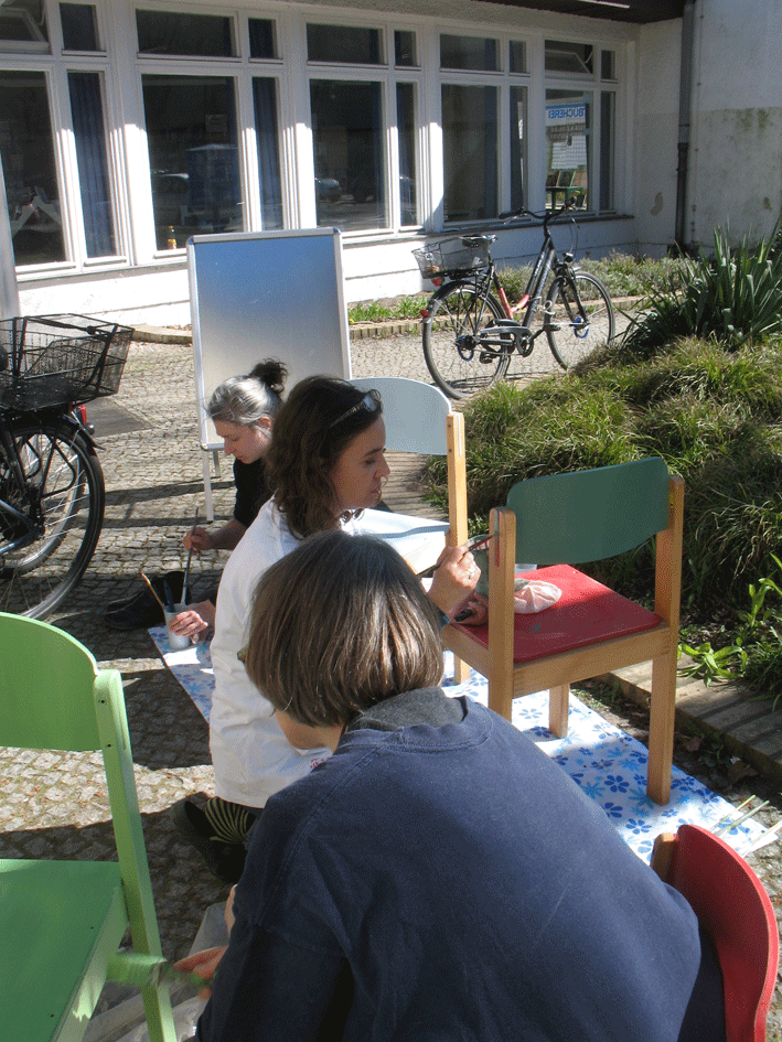 Da wir mit Farbpigmenten gearbeitet haben – damit jede von uns ihre individuelle Lieblingsfarbe anmischen konnte – 5 Frauen-5 Stühle – wurde natürlich viel überlegt, diskutiert, gewagt und …