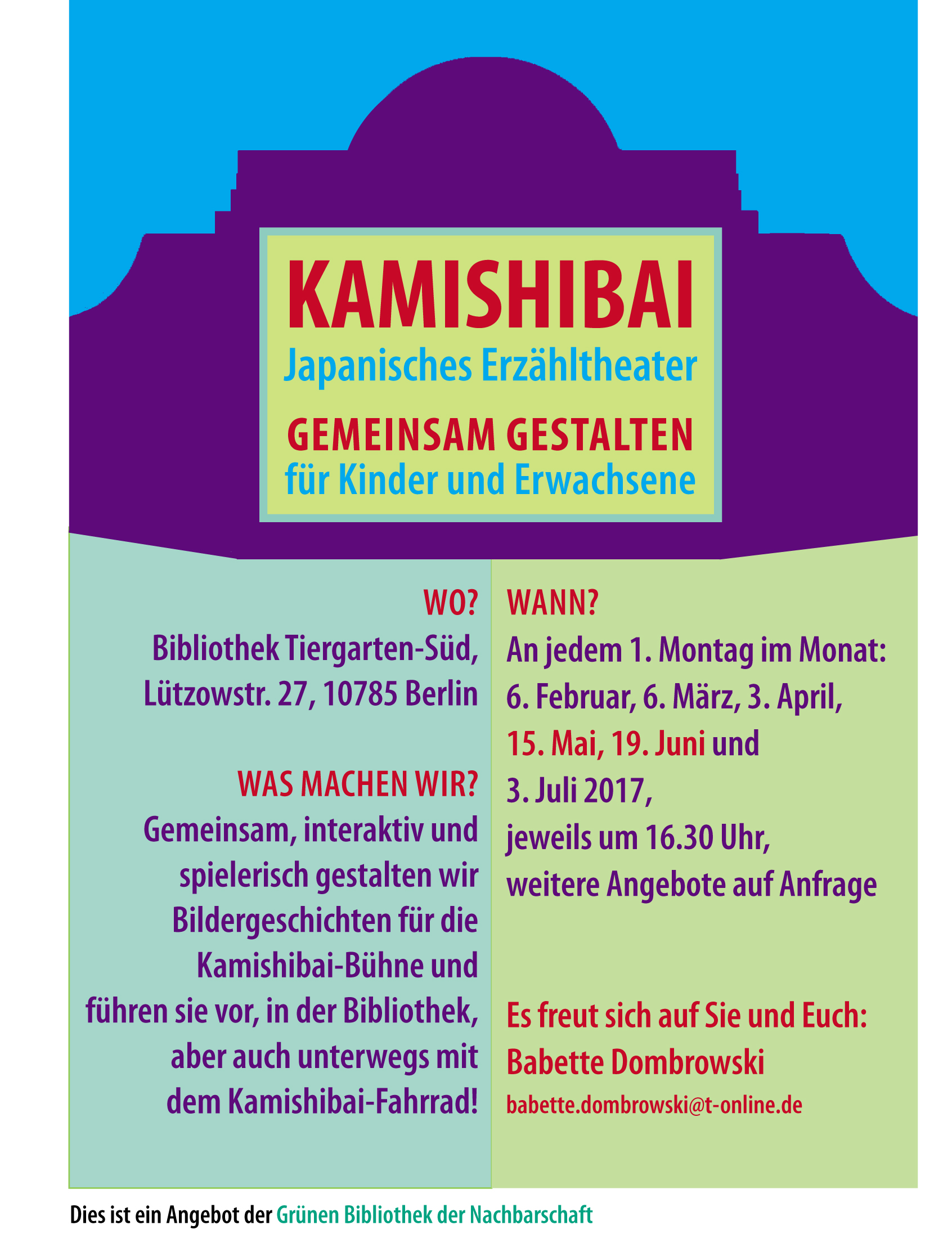 Veröffentlicht: Mai 10, 2017 Abgelegt unter: Die Grüne Bibliothek | Tags: Grüne Bibliothek, Kamishibai Hinterlasse einen KommentarAn alle großen un kleinen Freundinnen und Freunde des japanischen Erzähltheaters: