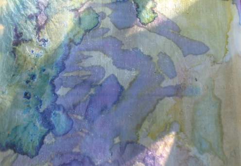 Dann experimentierten wir noch mit Farbveränderungen durch Änderungen des ph-Wertes und stellten fest, dass die gelbe Farbe der Tagetes mit Natron hellgrün ergibt, die magentarote Farbe der Mahonien-Beeren ebenfalls.