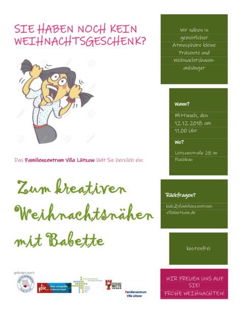 Veröffentlicht: Dezember 9, 2018 | Autor: ele54 | Abgelegt unter: Allgemein | Tags: Familienzentrum Villa Lützow, gemeinsam selbermachen, Nachbarschaft, Nachhaltigkeit, NähWerkstatt |Hinterlasse einen Kommentar
