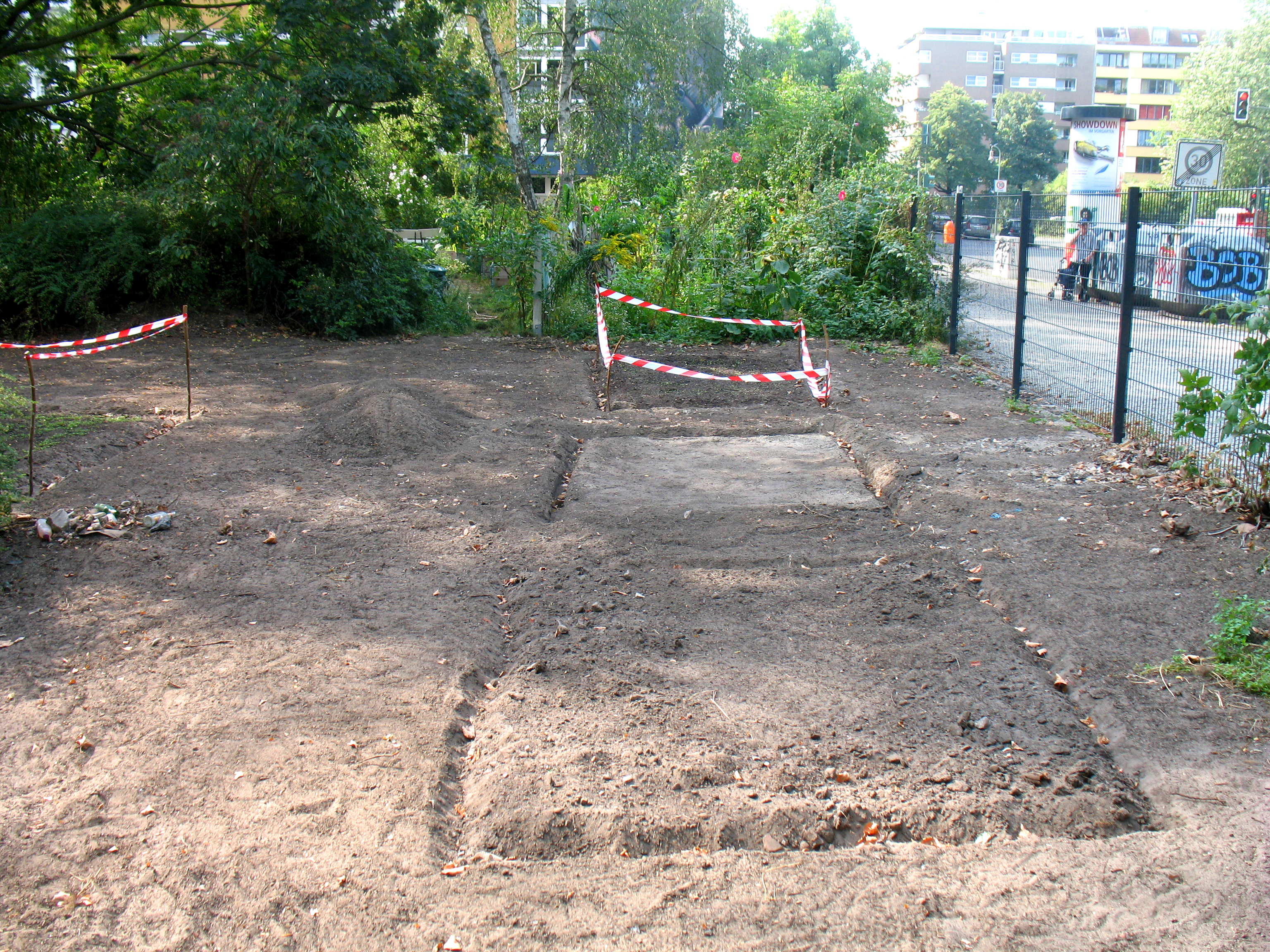 Und zurück blieb ein über Jahre mit schweren Baufahrzeugen befahrener Boden, in dem noch nicht einmal ein Spaten stecken blieb…