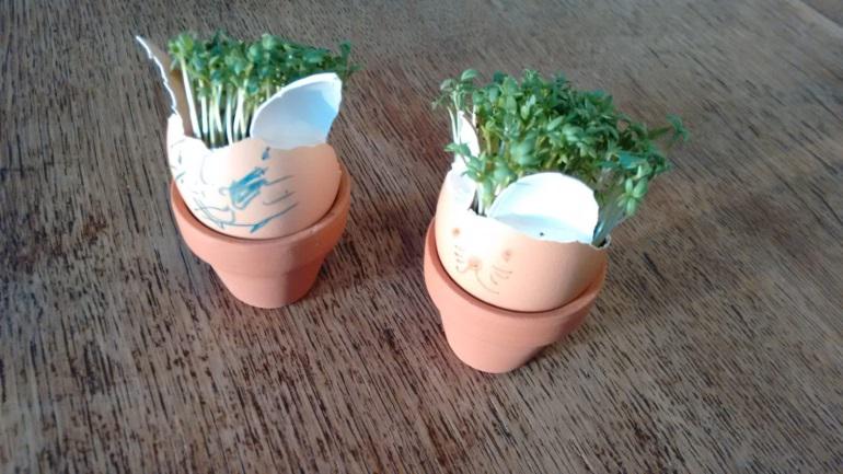 Die Eierschalen sollten bemalt und mit Erde gefüllt und darin Kressesamen ausgesät werden. Der Plan war, dass zu Ostern geerntet werden kann. Wie man sieht, ist der Plan aufgegangen, so sehen die Eierhasen von Leandra und Jonathan am Gründonnerstag aus: