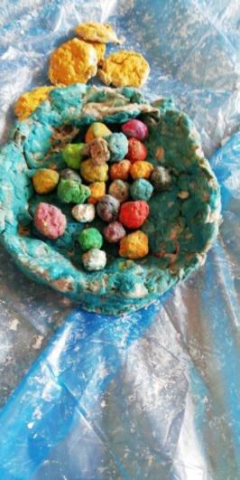Am Dienstag, den 31.3., zur Buchstäblich-Zeit wurde mit aufbewahrten Eierschalen und Pappmaché gearbeitet.