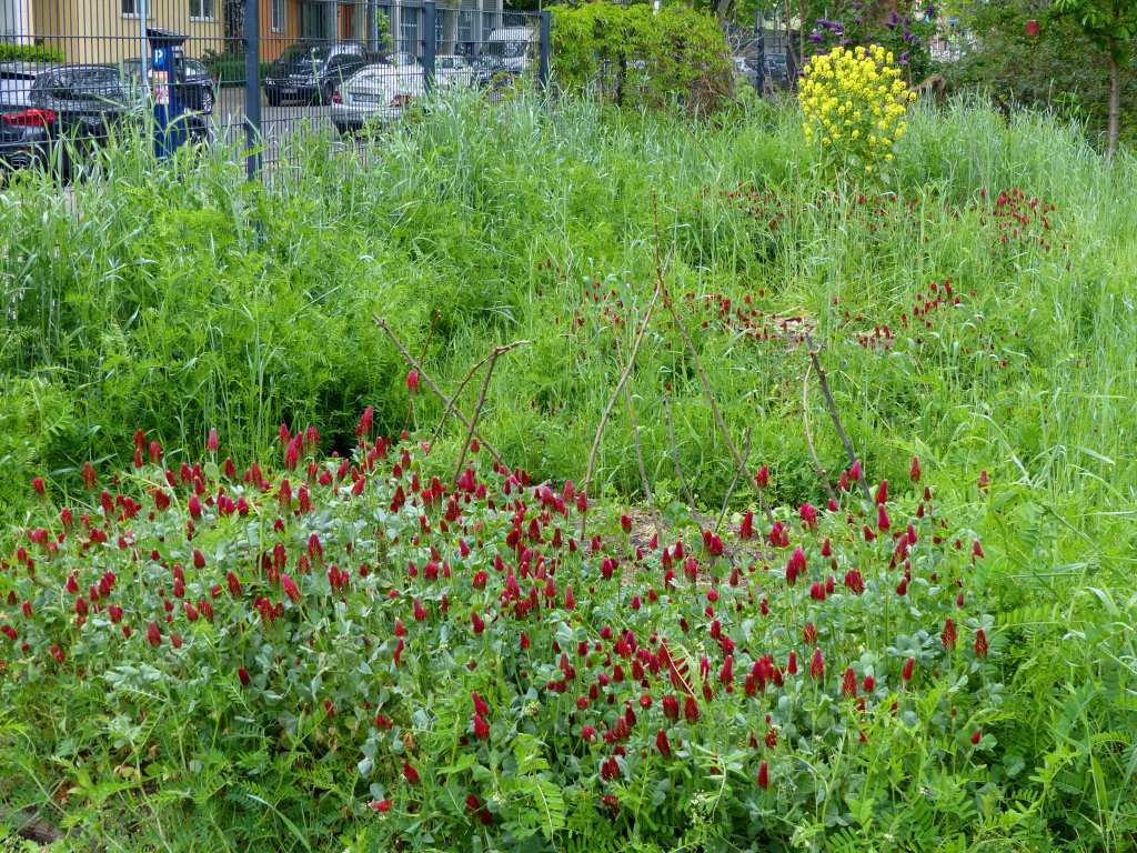 Also begannen wir im Herbst letzten Jahres mit der Revitalisierung der Erde. Zunächst säten wir bestimmte Pflanzen aus, um den Boden gut über den Winter zu bringen. Dazu nutzten wir Inkarnatklee, der uns noch mit seiner Schönheit überraschen sollte, und eine Mischung aus Winterroggen und Winterwicke. So war unser Boden bis zum Frühjahr bewachsen und gegen weitere Austrocknung geschützt.
