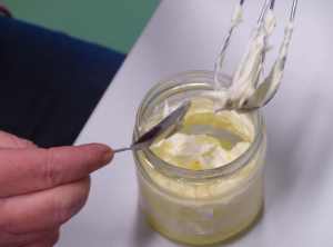 Nach dem Erkalten schlägt man das Ganze mit einem Handmixer vorsichtig auf (wer gerne seine Mayonaise selber macht, weiß, wie es geht), bis sich eine cremige Körperbutter gebildet hat.