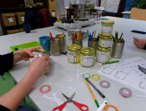 Wir arbeiten bei offenen Türen in der Werkstatt des Kiez Zentrums Villa Lützow und tragen Maske, wenn wir den Sicherheitsabstand nicht einhalten können.