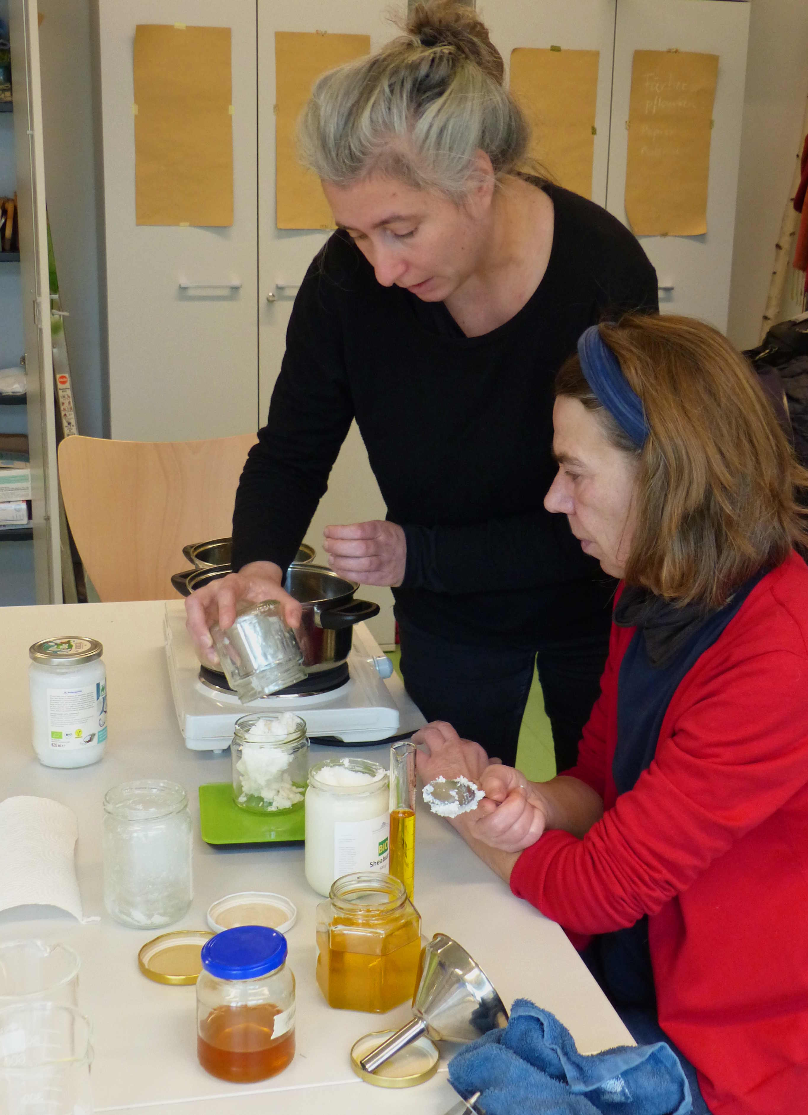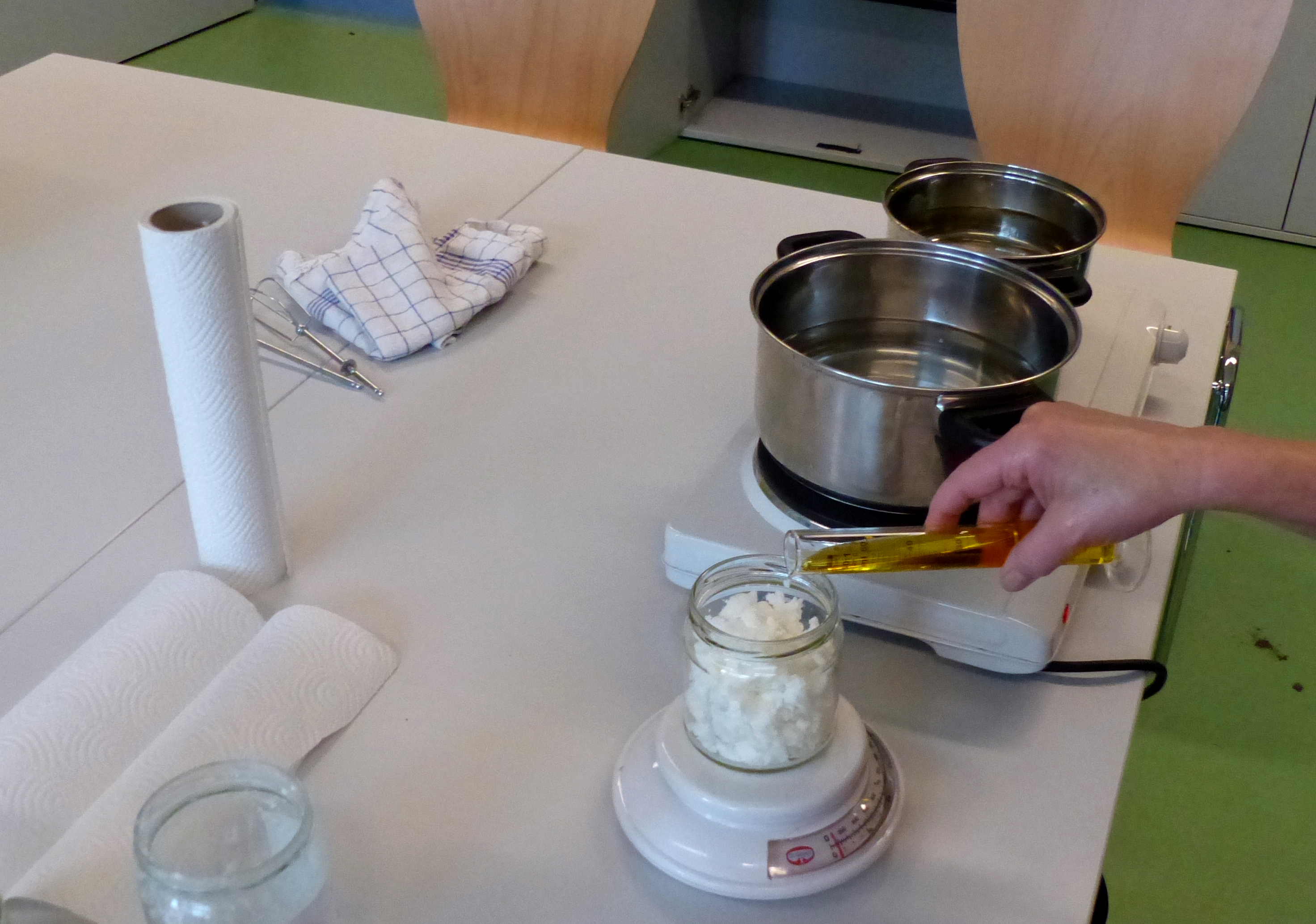 Die Ingredienzien werden im Wasserbad erwärmt und miteinander vermischt. Achtung, hier unbedingt darauf achten, dass die Mischung nicht zu heiß wird, sonst können die wirksamen Inhaltsstoffe verloren gehen!