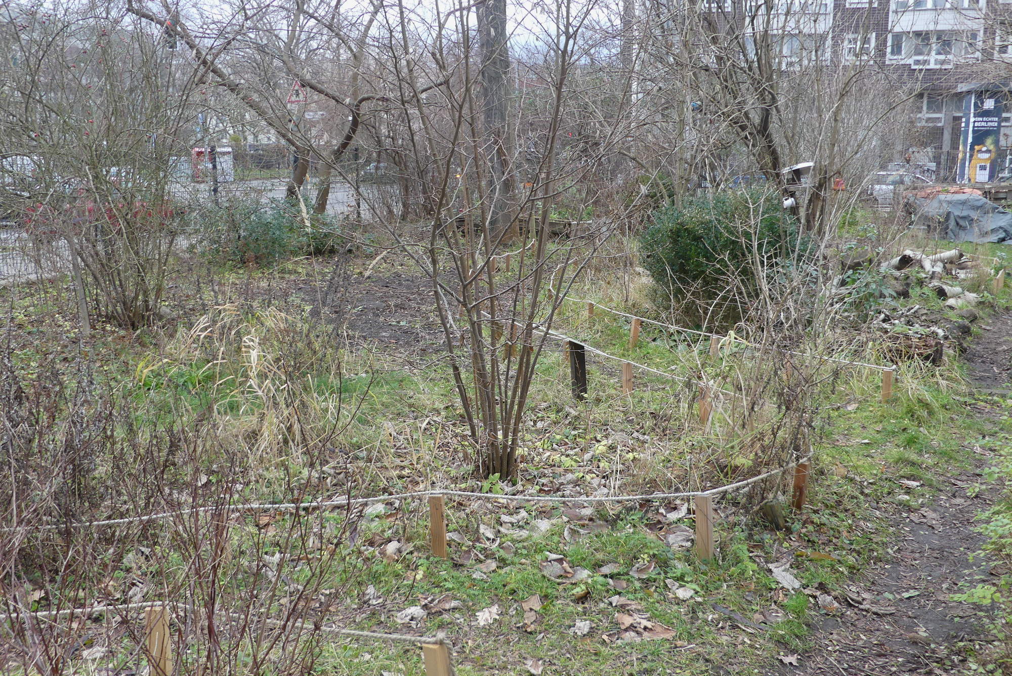 Einige der im letzten Jahr neu gepflanzten Wildblumen zeigen, dass sie gut angewachsen sind und werden voller Freude auf künftige Blütenpracht und Nahrung für Insekten begrüßt. Wie schön, das wuchsfreudige Leben im Wintergrau der Stadt zu finden.