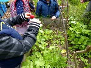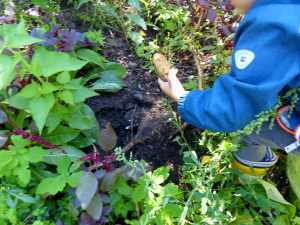 Dabei wird auch viel für Ausbildung der Grob- und Feinmotorik getan: wir schaufeln und hacken und die Kinder lernen, wie sie mit Spaten und Grabegabel umgehen können.