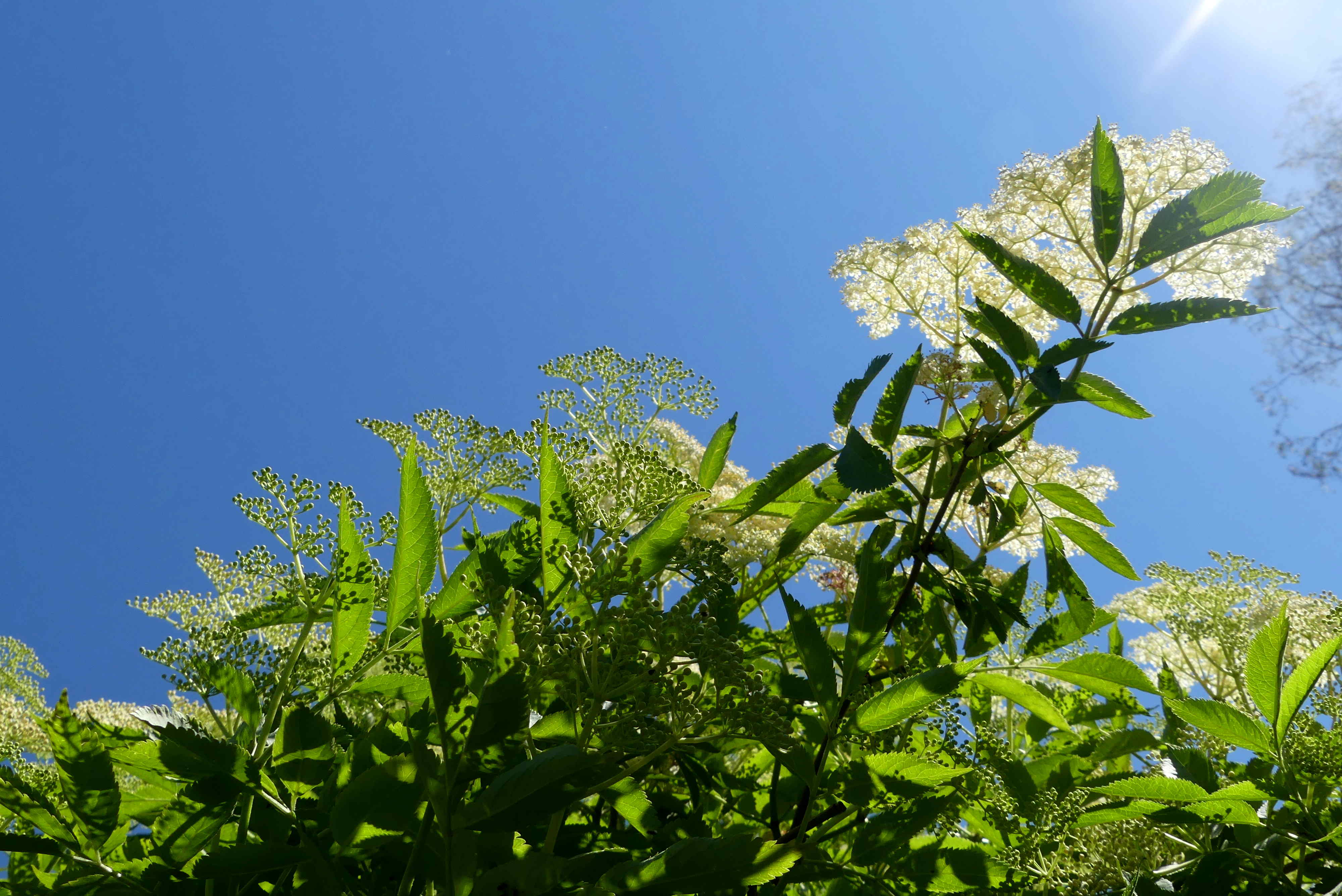 Bestes Sonnenwetter im Spätfrühling – und in userem Garten blüht der Holunder in Hülle und Fülle.