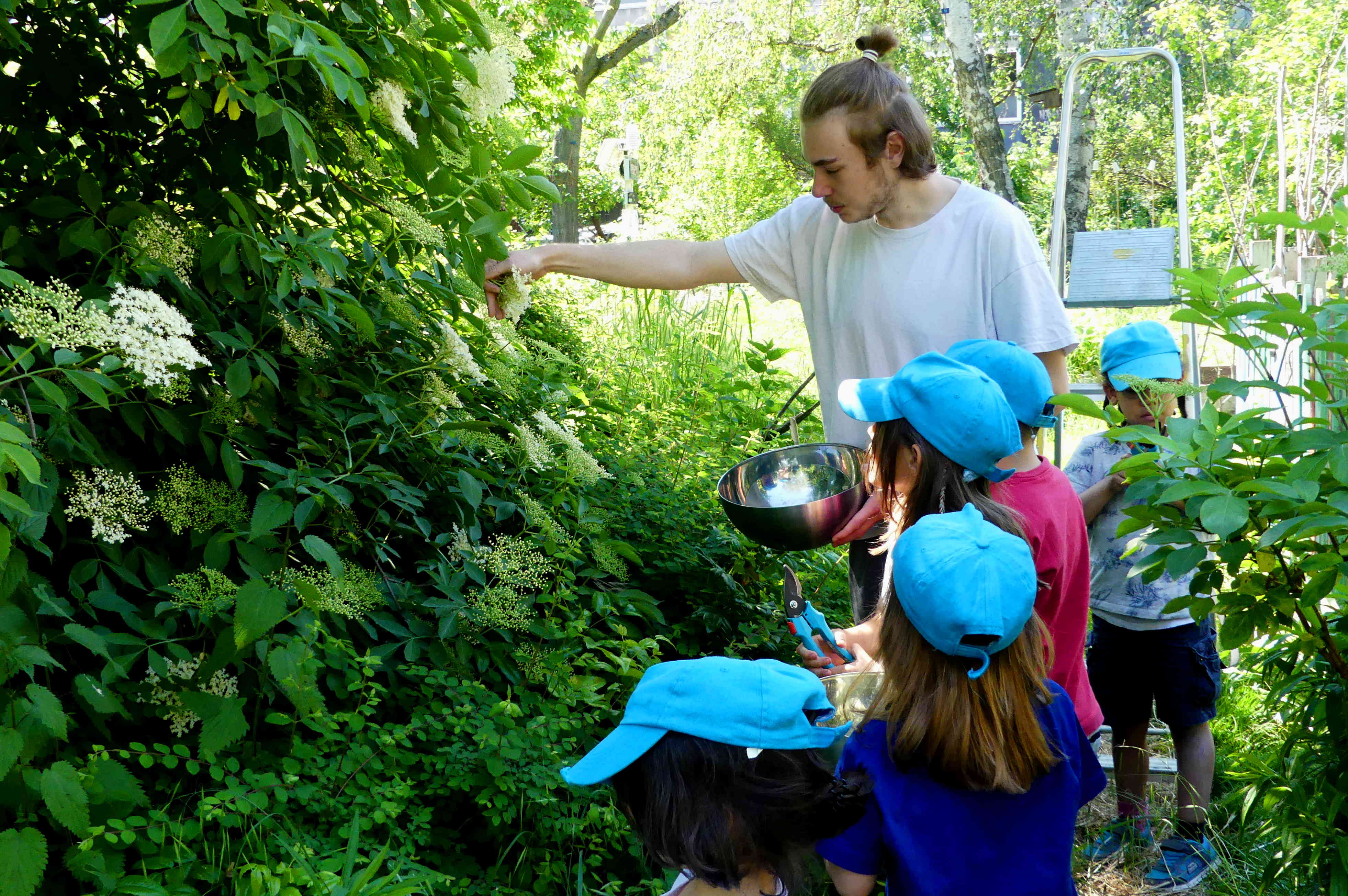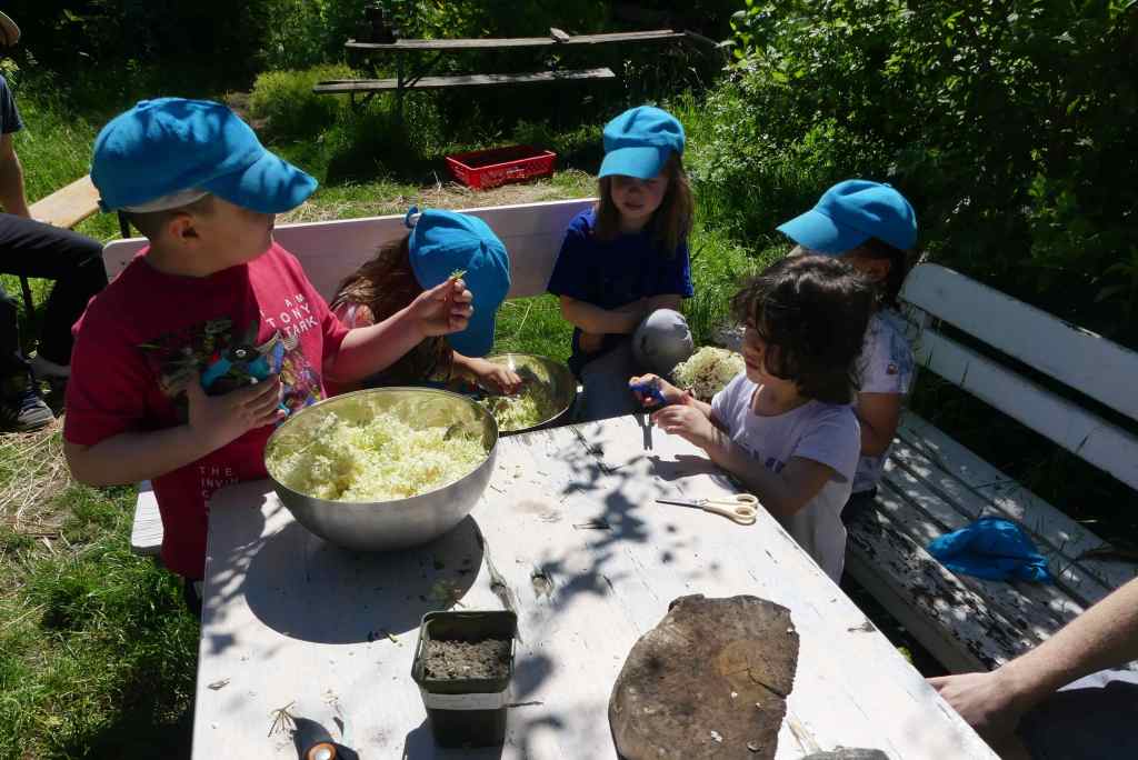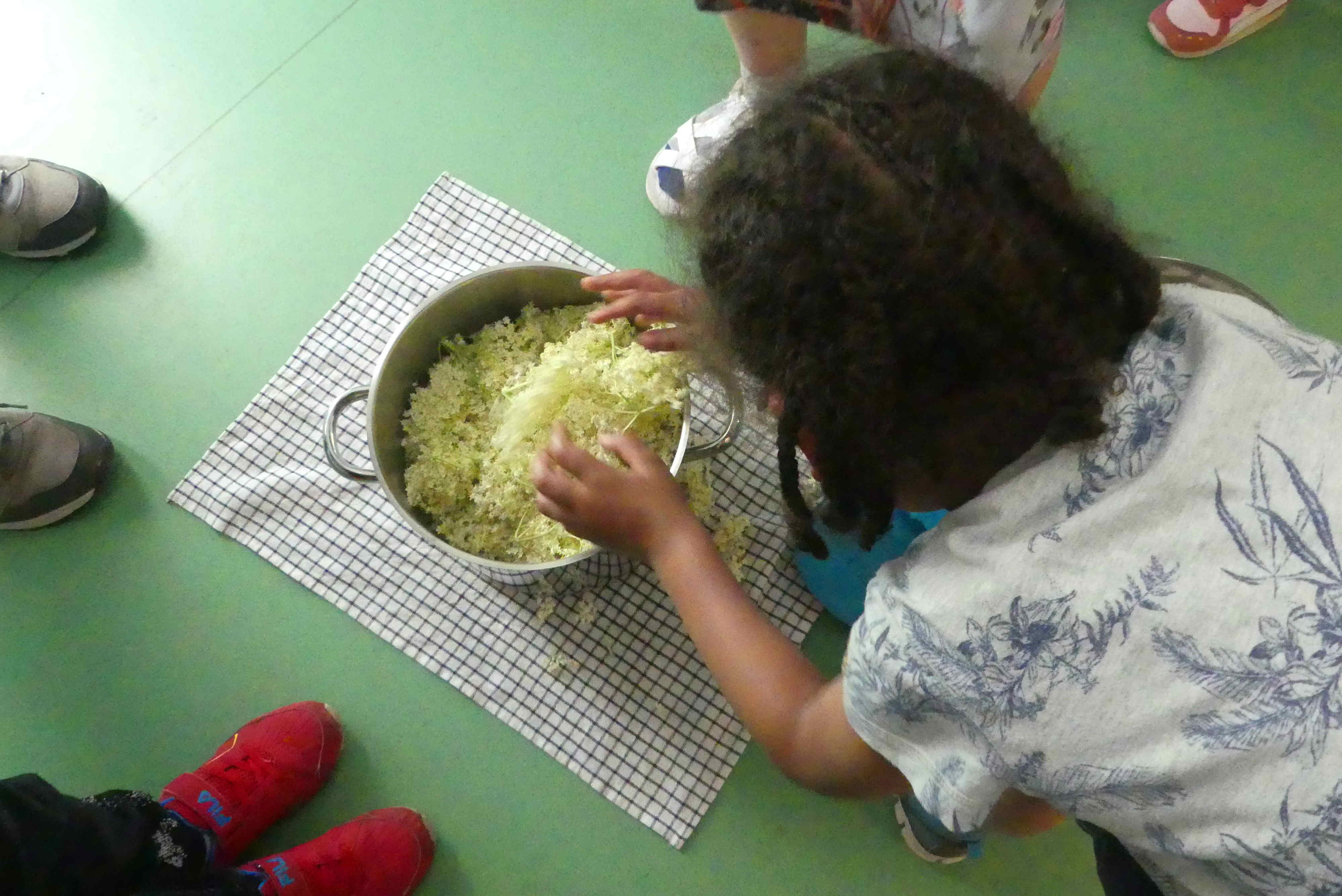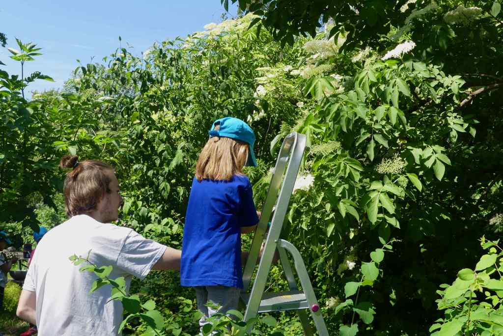 Aber bald haben die Kinder die ausreichende Menge der wuderschönen und reich duftenden Dolden gepflückt, jetzt gehen diese noch einmal in die Endkontrolle, wir wollen ja schließlich keine kleinen Tierche in unserem Sirup haben…