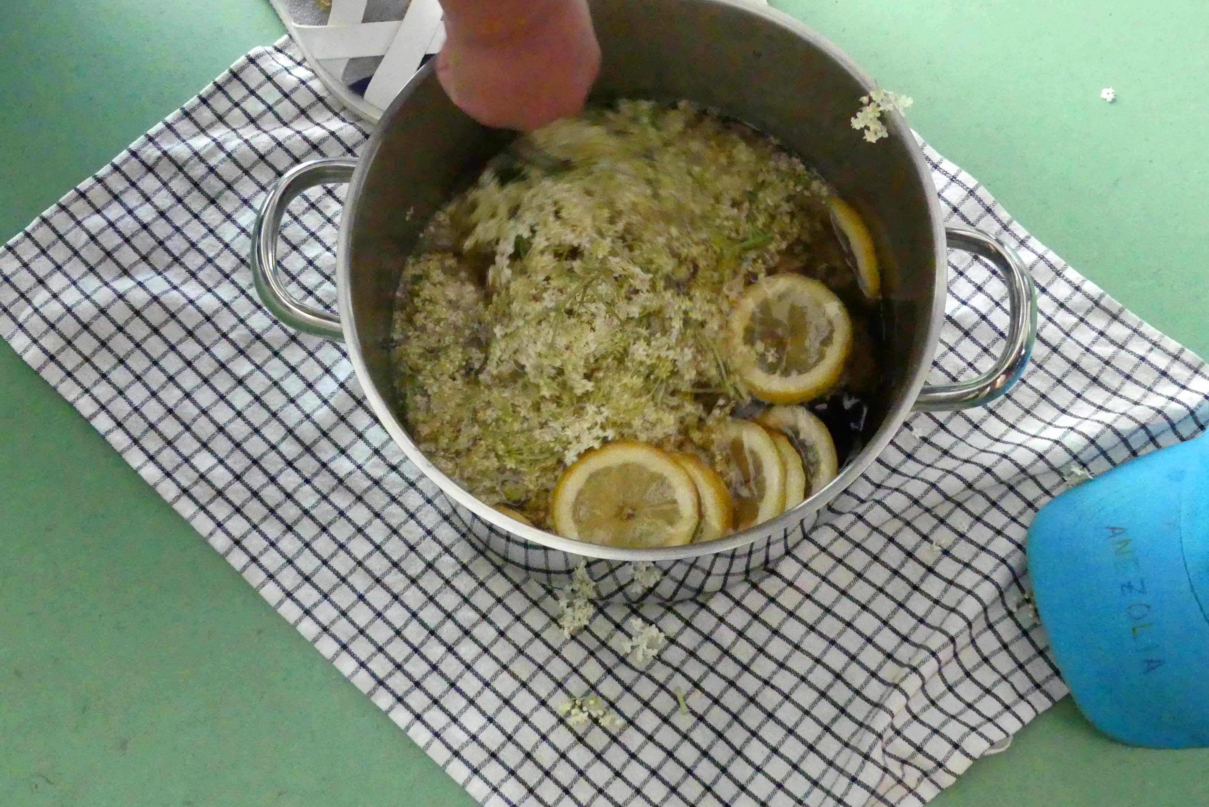 Dann die gesäuberten Blütendolden (ca. 50 Stk.) unterrühren, 1-3 Tage stehen lassen, gelegentlich umrühren.