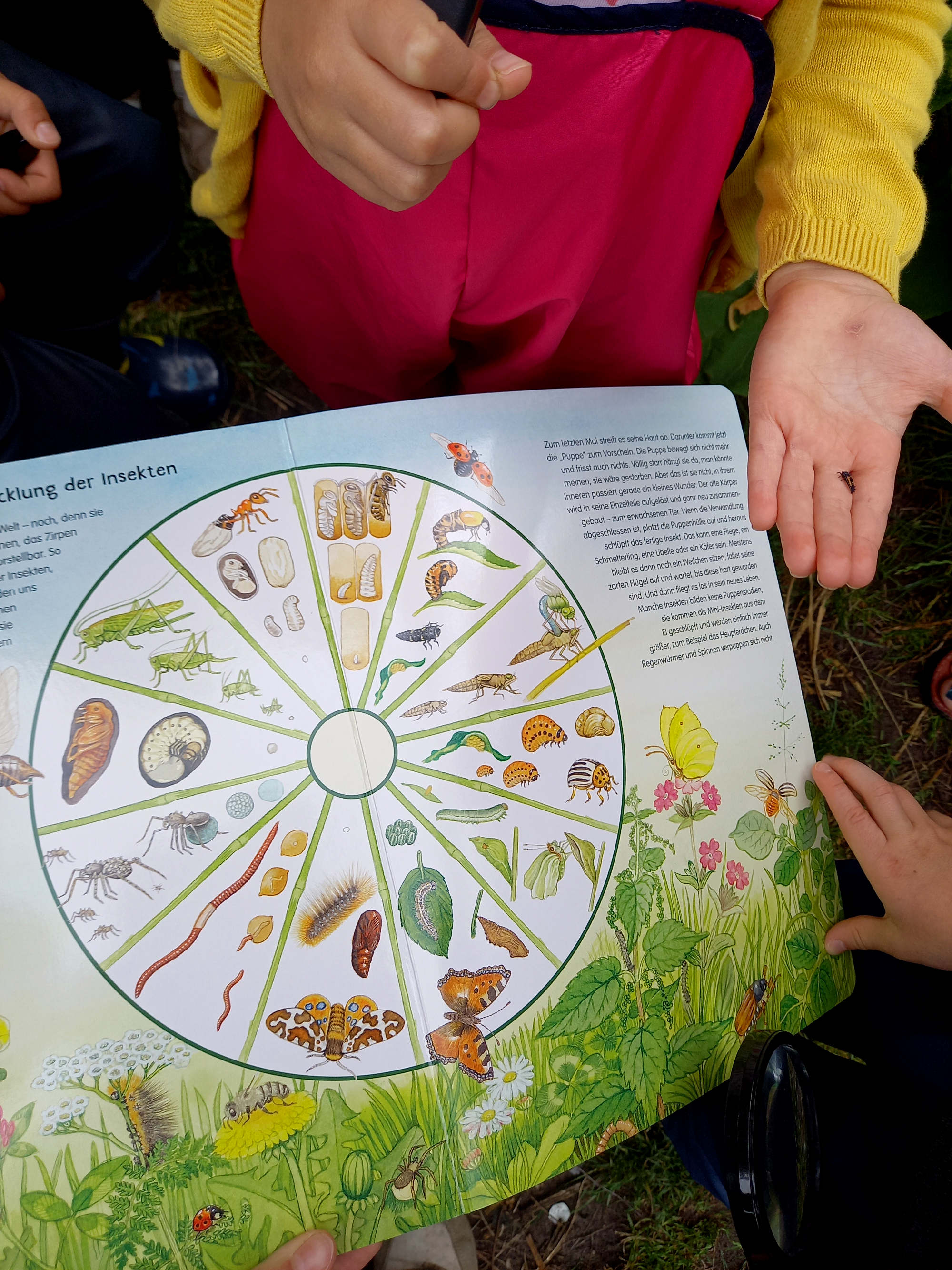 Wie sich herausstellte, ist dies durchaus unterschiedlich. Während die Spatzen und Finken in unserem Garten hauptsächlich Körnerfresser sind, füttern sie während der Brutzeit aber ebenfalls Insekten, da die junge Vögel das tierische Eiweiß benötigen. Die anderen Singvögel fressen den Sommer über Insekten, Würmer, Larven, Läuse, Beeren, was uns dazu bewogen hat, mit den Kindern mit Lupen auf die Suche nach Insekten in unserem Garten zu gehen.