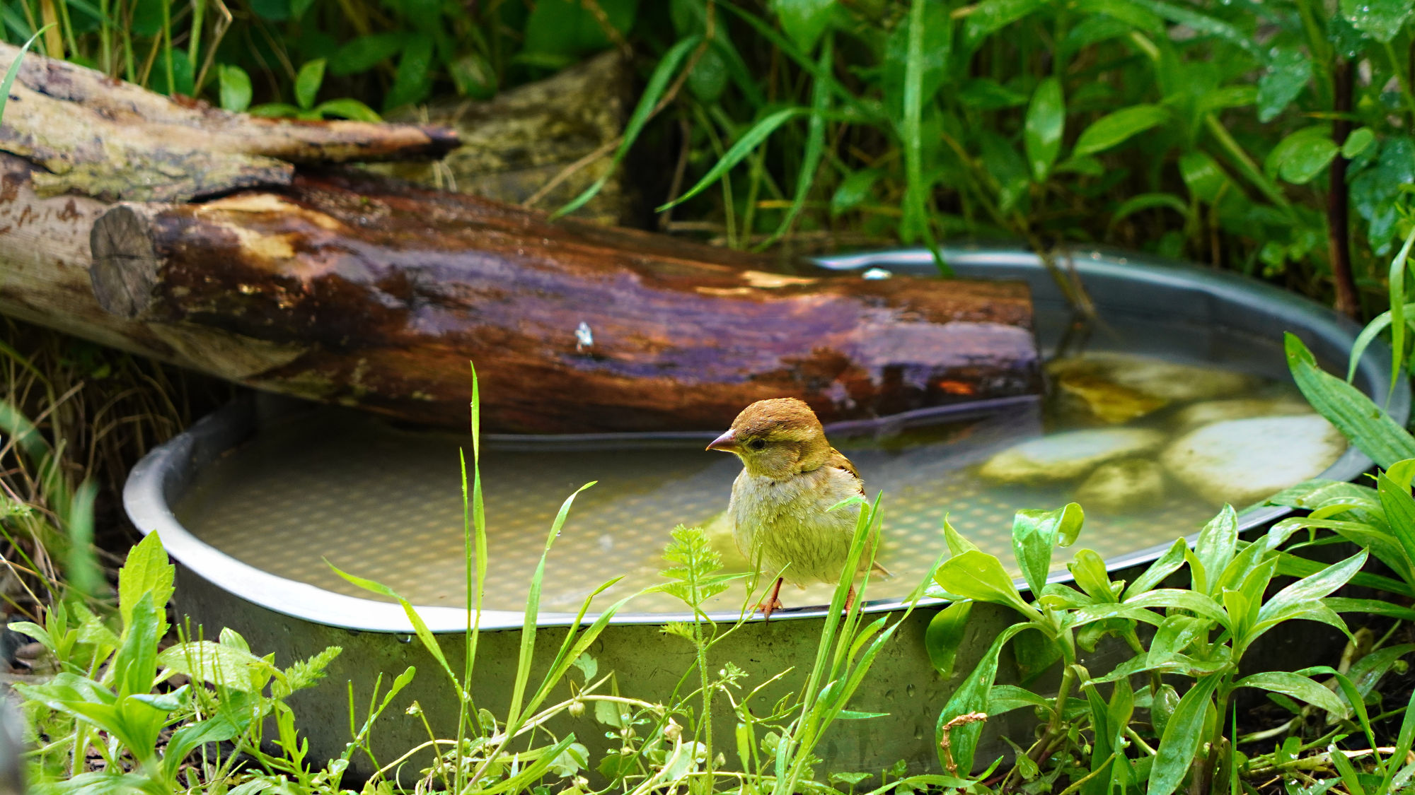 Und auch an der Vogeltränke und -bad lässt sich dann doch noch ein durstiger Spatz blicken.