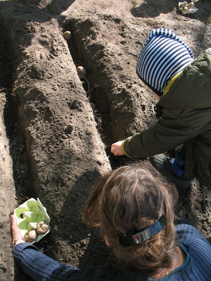 Ohne diesen erschreckenden Hintergrund zu vergessen, legen wir in unserem Gemeinschaftsgarten ein Kartoffelbeet an, um wieder ein Gefühl dafür zu bekommen, dass die meisten unserer Lebensmittel aus dem Erdboden kommen und dass Kultivierung und vieles andere mehr anstatt von reiner Chemie vonnöten ist, um später eine leckere Kartoffel essen zu können.