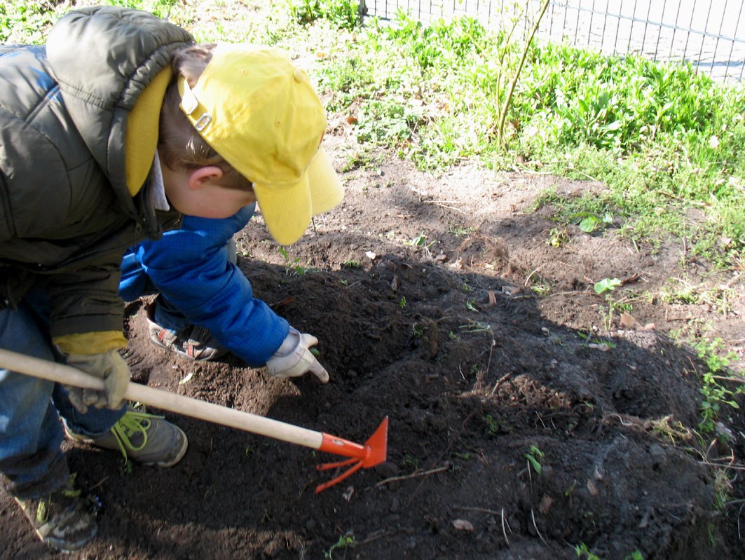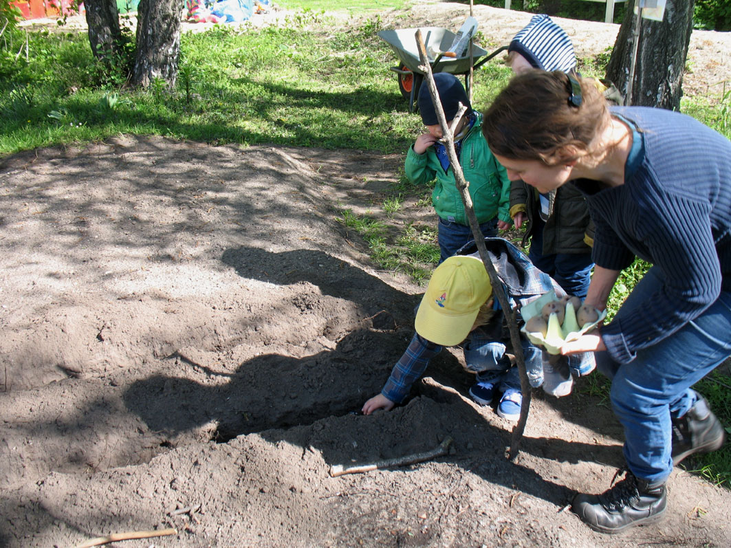 Julia erklärte den kleinen Gärtnern vorher anschaulich, wie es die Kartoffeln gerne gemütlich in ihrem Bodenbett haben möchten und es ging ans In-den-Boden-Setzen.