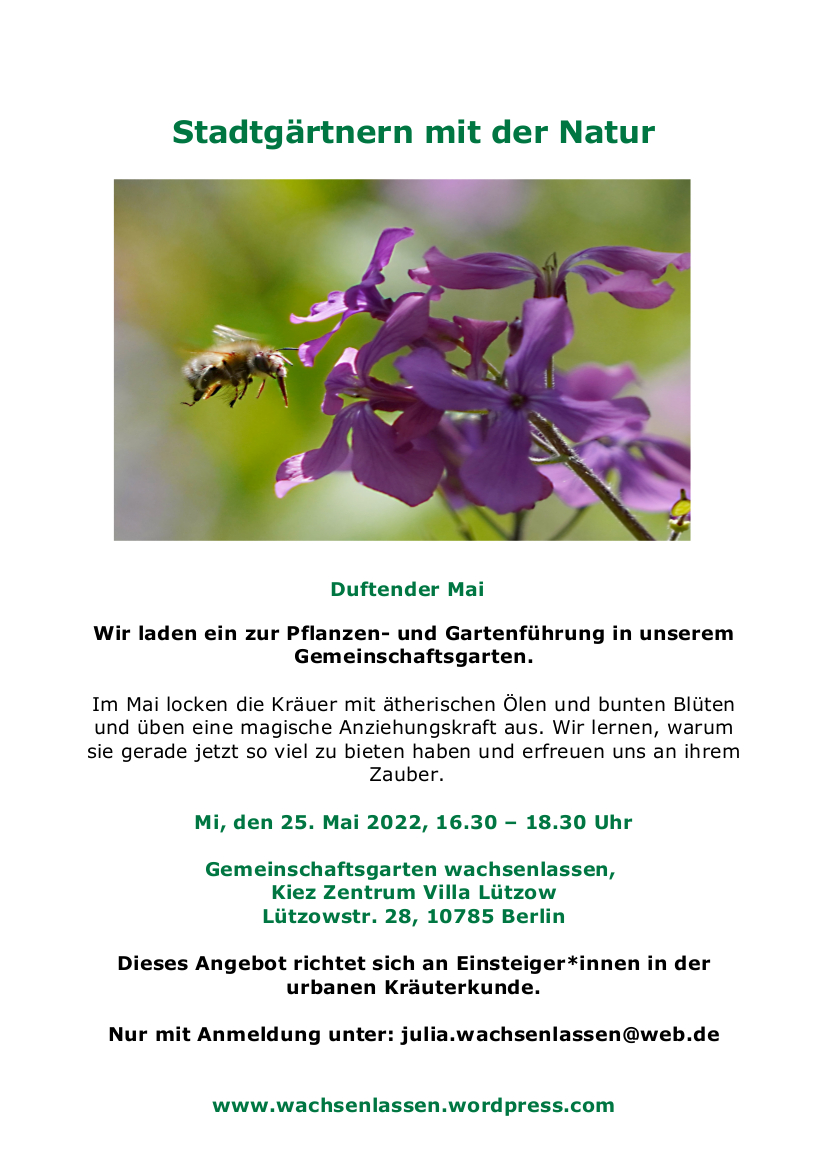 Veröffentlicht: Mai 20, 2022 Abgelegt unter: Gemeinschaftsgarten, Kräuter und Heilpflanzen | Tags: Artenvielfalt, Gartenführung in Berlin, Gemeinschaftsgarten wachsenlassen, Kräuterkunde, Urbanes Gärtnern Hinterlasse einen Kommentar