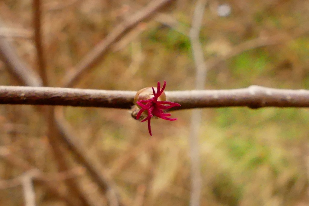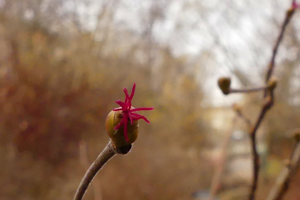 Einen besonderen Reiz haben für mich in jedem Jahr die weiblichen Blüten, winzig klein und leicht zu übersehen, sie bleiben von der Knopse eingeschlossen und nur die purpuroten Narben sind am Rand zu sehen. Hier ist ein aufmerksames Hinschauen angesagt.