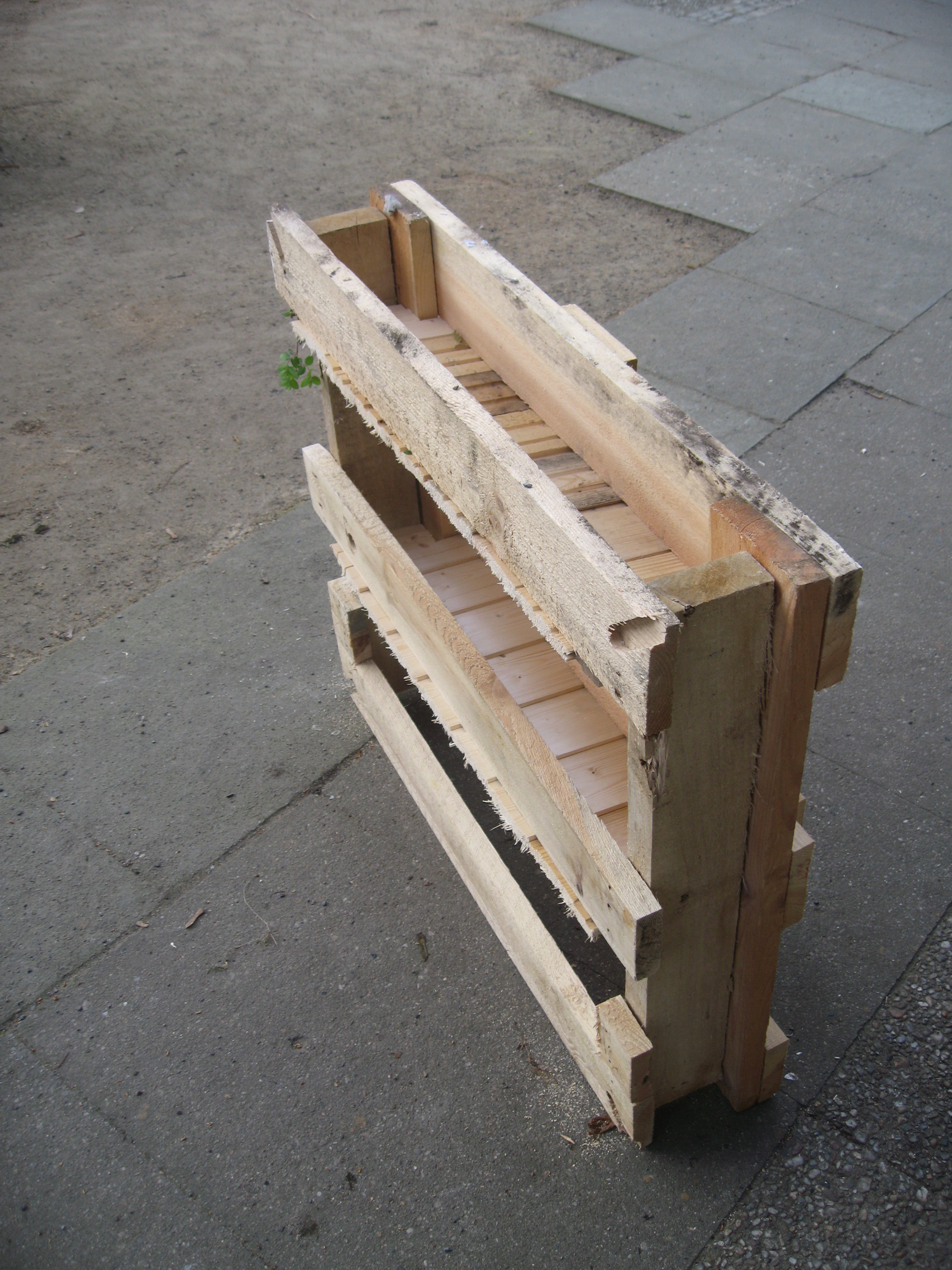 diese woche haben wir begonnen, unser etagen-erdbeerbeet zu bauen: neulich lagen da irgendwo zwei verwaiste paletten rum, und die bilder von hochkant stehenden etagen-palettenbeeten geistern ja überall rum im netz. die idee war also ein zusammentreffen von zufällen – die musste ich dann noch kurz gegenüber den gärtnerinnen verteidigen (oder: erklären?), und länger drüber schlafen, wobei ich das planen dann doch gleich hab bleiben lassen. es sind also bloss zwei zusammengeschraubte paletten, wobei die eine deutlich schmaler war, als die andere. die böden könnten auch zugeschnitten werden; da wir aber das benutzt haben, was vorhanden war, hab ich auch das bleiben lassen und viele kleine hölzer mit dem grossen und kleinen begleiter angeschraubt. wir werden das beet nächste woche in den boden eingraben, deshalb zuunterst kein boden. und wenn dann die ersten tauglichen erdbeerpflänzchen zu finden sind, wird eingesetzt.