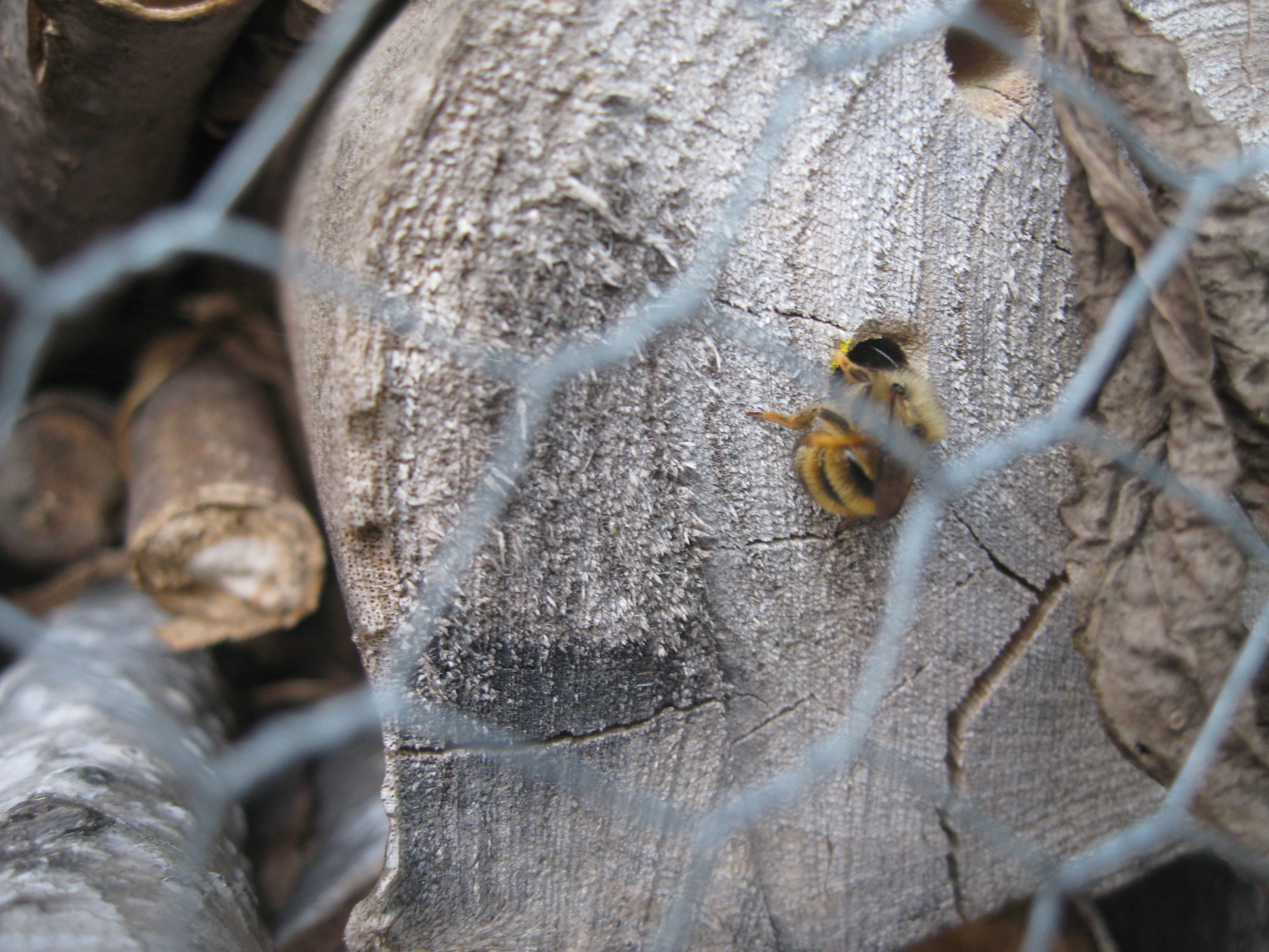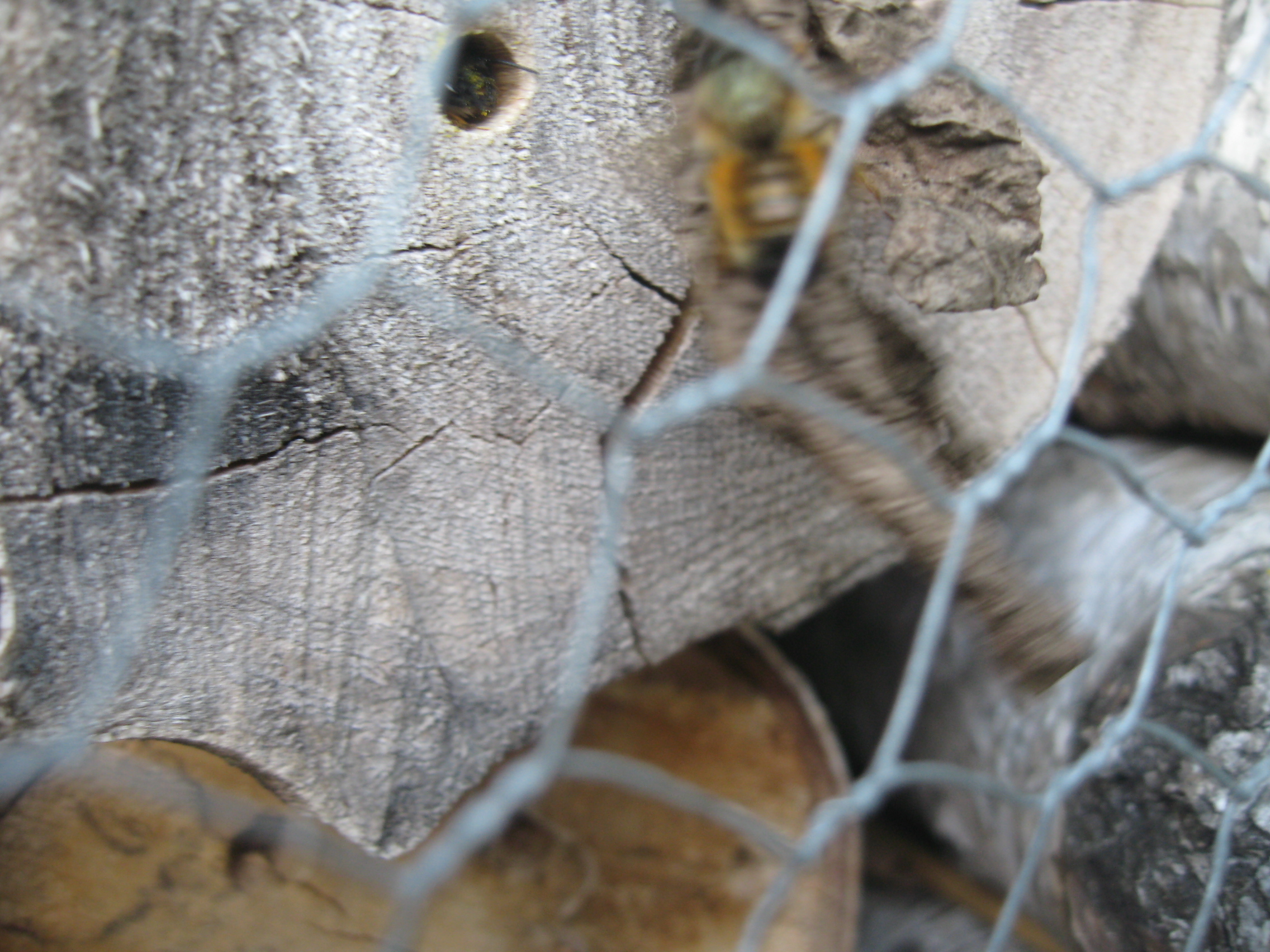 während wir da so rumschraubten an der pflanzen-behausung bemerkten wir kleine streiben am insektenhotel: vor manchen türen hängt schon ein „bitte nicht stören“-schild: versiegelt. weiter oben bemühte sich erst eine, dann zwei biene, das passende zimmer zu finden. später blieb die eine drin und ich bin sicher, die andere kam mit nistmaterial zu klein für mein auge immer wieder angeflogen.