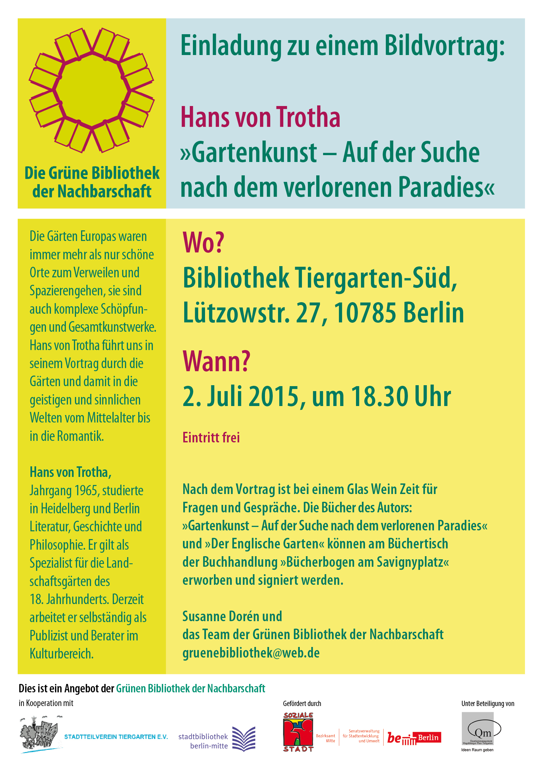 Veröffentlicht: Juni 12, 2015 Abgelegt unter: Die Grüne Bibliothek | Tags: Bibliothek Tiergarten-Süd, Buch und Garten, Grüne Bibliothek Hinterlasse einen KommentarGBN_Einladung_Bildvortrag Hans von Trotha