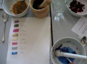 Das Pflücken der Blüten, das Zermörsern und Ausprobieren: wieviel Wasser, wie zerkleinert, wer färbt wie?