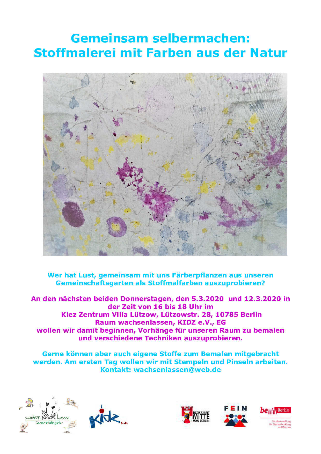 am 12.9. und 19.9., Donnerstag Nachmittag 16.00, findet gemeinsam mit dem Familienzentrum Villa Lützow ein ‚Malen mit Färberpflanzen‘ Workshop statt.