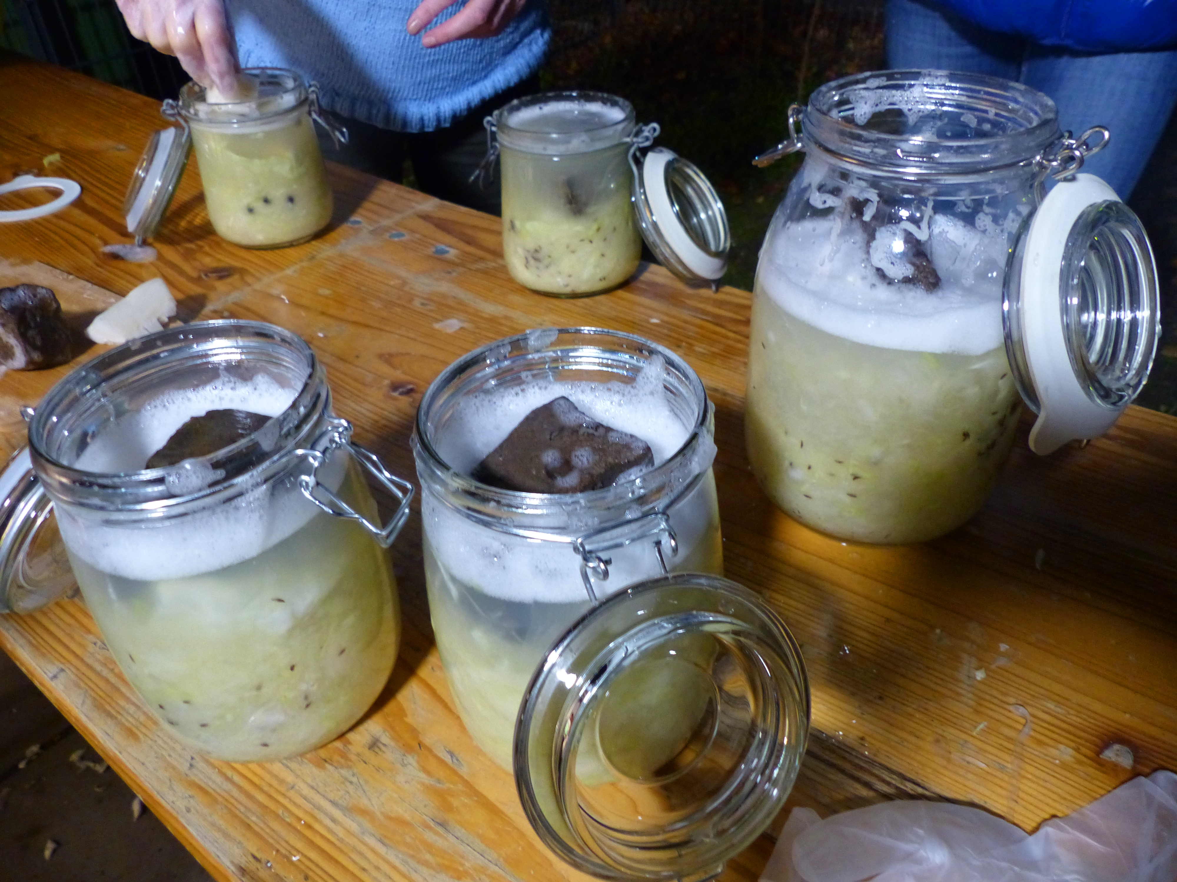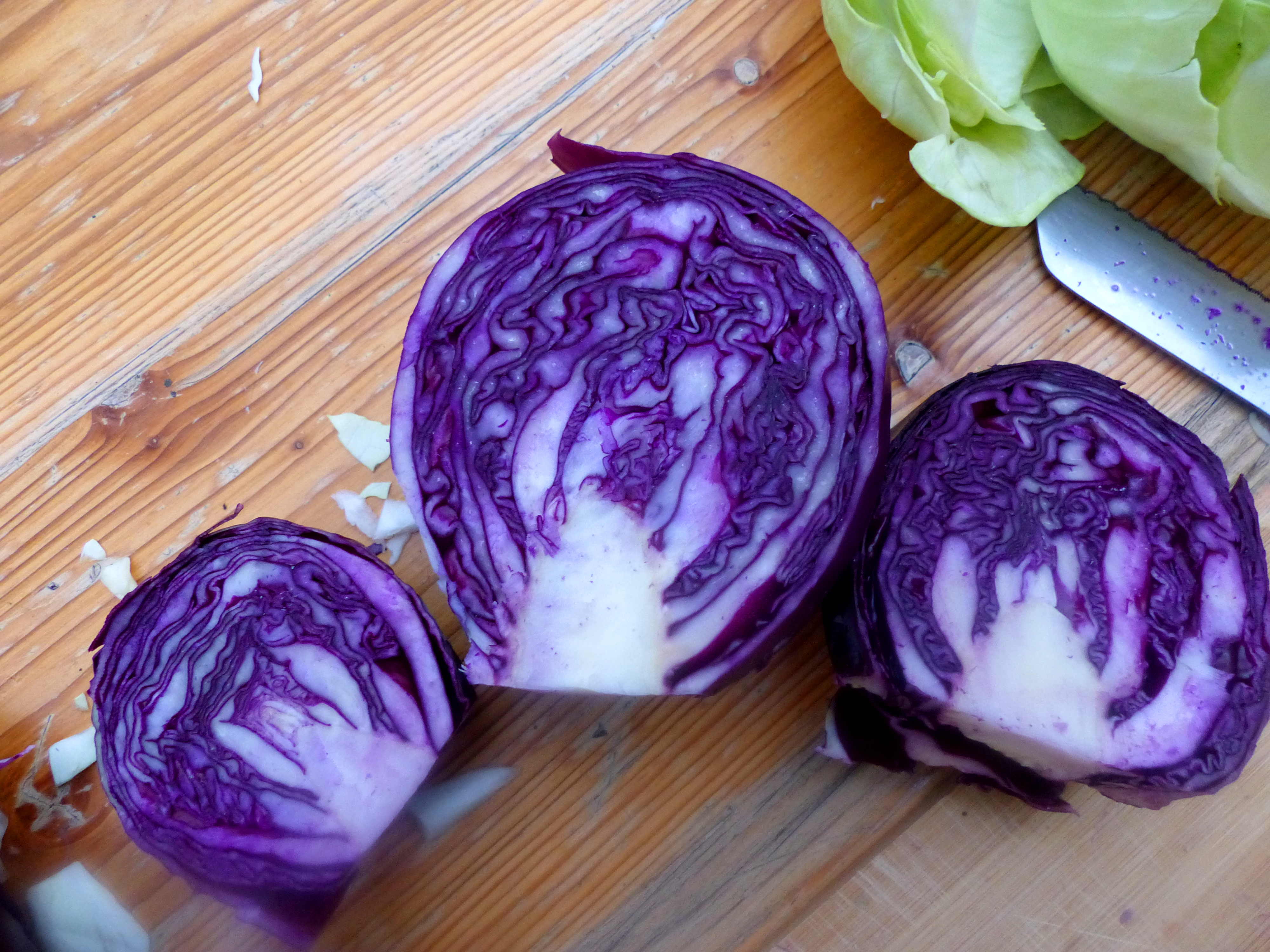 Rotkohl – immer eine Augenweise, wenn er aufgeschnitten wird – haben wir dann eine Woche später auch noch geerntet und mit Äpfeln der Milchsäurergärung überantwortet.