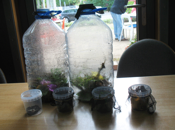 Da wir die Tiere über die Tage beobachten und zeichnen wollten, erhielten sie von uns ausreichend – wie wir hofften – ausgestattete Übergangswohnungen, welche wir mit Erde, Blättern, Holz und Feuchtigkeit auslegten.