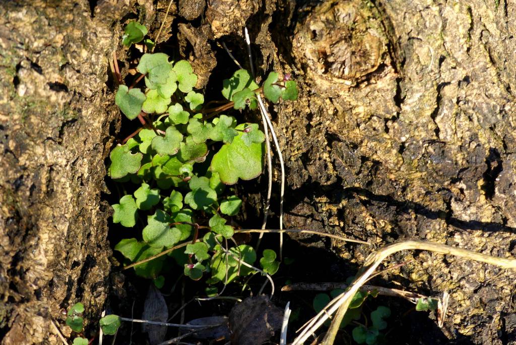 Das heimische Mauer- Zimbelkraut, Cymbalaria muralis, blüht zwar erst ab Juni (dann muss man sich noch einmal bücken, um seine Schönheit zu erkennen), aber wird jetzt schon freudig begrüßt beim Wiederentdecken!