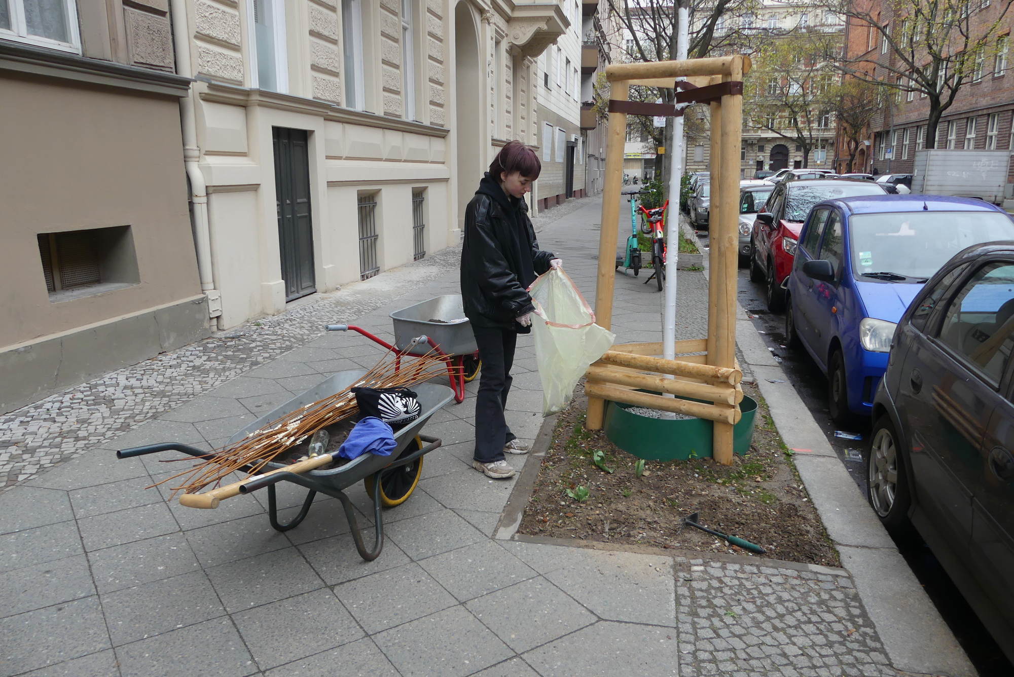 Am 6.4.2022 haben wir damit begonnen, die Baumscheiben in dem für eine Sperrung des Durchgangsverkehr vorgesehenen Bereiches zu begrünen.