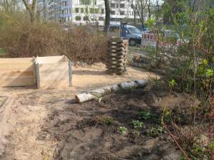 Zudem haben wir begonnen, einen Sandplatz für Wildbienen (und wer weiß, wer sich noch dort wohlfühlen wird) mit Totholz, Steinen und einer Vogel-/ Insektentränke zu gestalten.