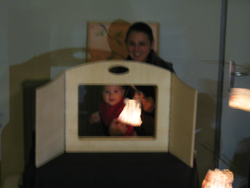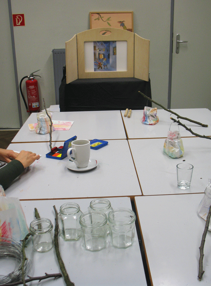 Hier werden Geschichten erzählt und gestaltet und mit der Kamishibai-Bühne vorgeführt.
