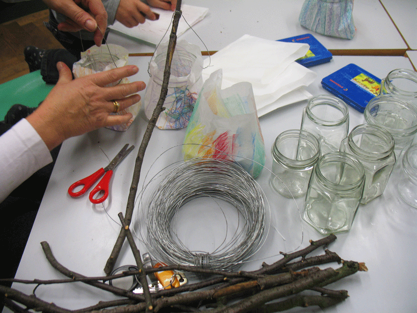 Teelichter, Butterbrotpapier, Malstifte, Draht und einen Stab, wir haben hier einfach kleine Äste aus dem Garten genommen, die noch zusätzlich schick aussehen.