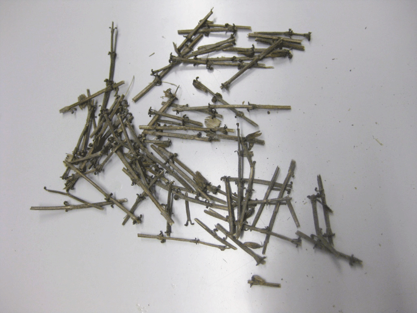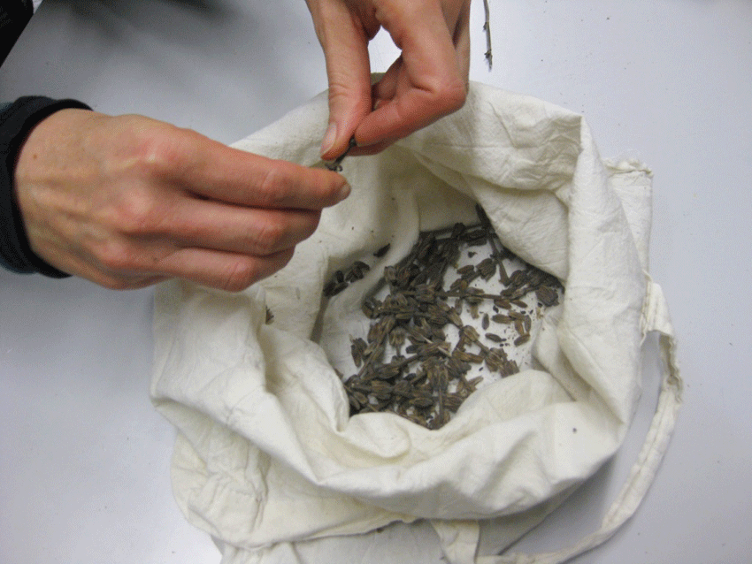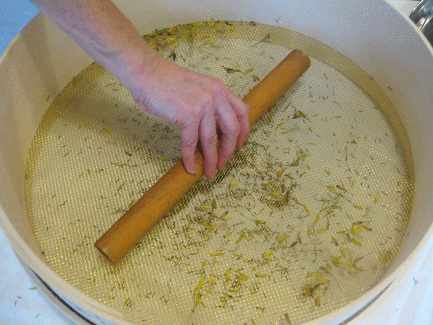 Zunächst wurden die Früchte von den kräftigen Stielen getrennt, doch die vielen Teilkapseln öffnet man nur durch kräftiges Walken im Leinsack und anschliessendes Reiben über den Boden eines Siebes. Durch Wegpusten der letzten Hüllreste erhält man schlussendlich das einigermaßen gereinigte Saatgut.