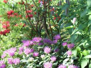 Allen voran natürlich die drei Dolden des wunderbaren Phloxes, sie duften um die Wette. ( Übrigens gehört der Phlox übrigens zur Familie der Himmelsleitergewächse /Polemoniaceae, das passt doch).