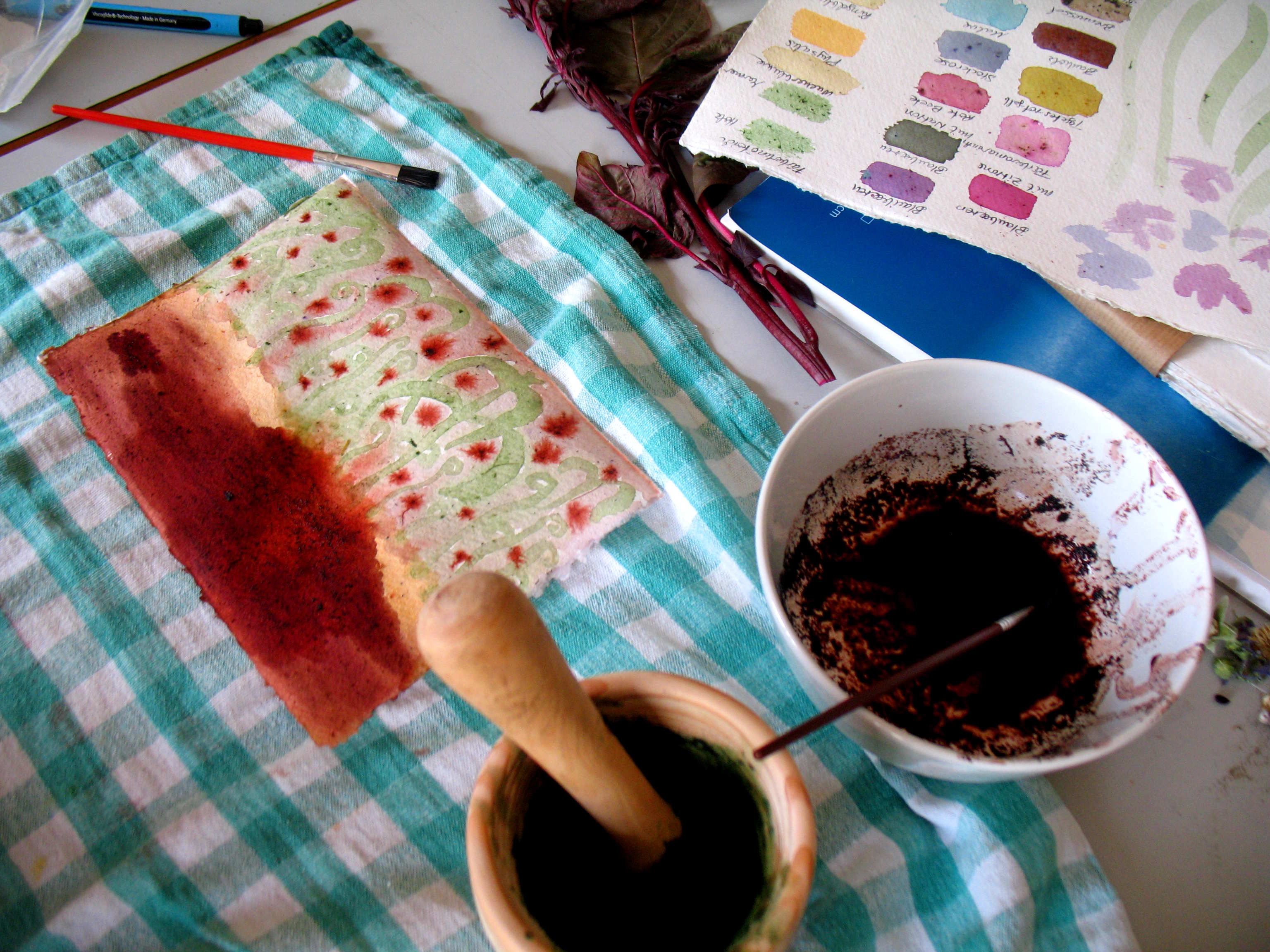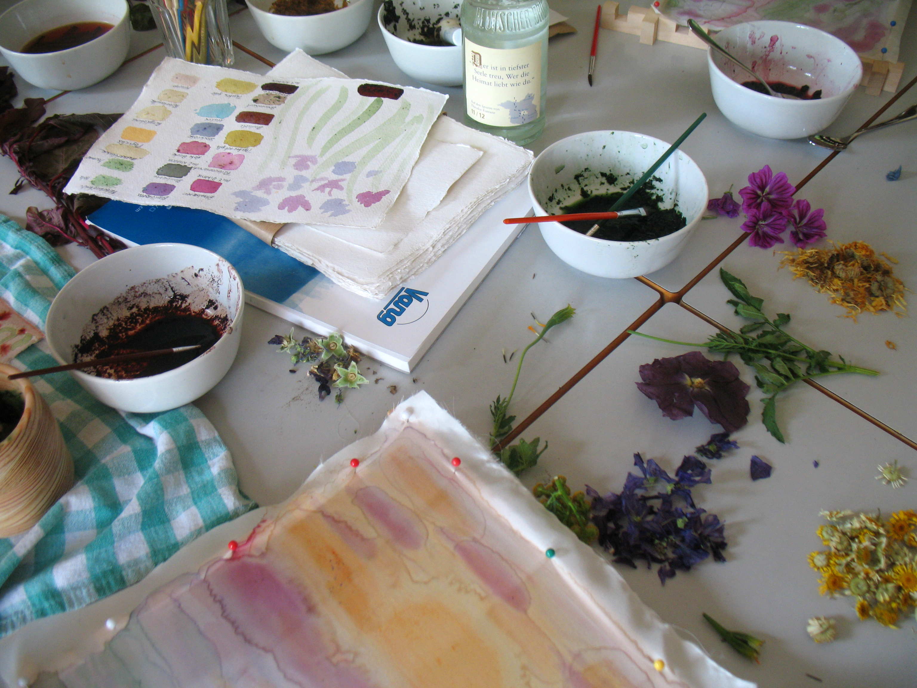Das Pflücken der Blüten, das Zermörsern und Ausprobieren: wieviel Wasser, wie zerkleinert, wer färbt wie?