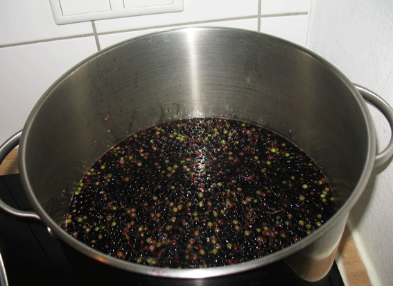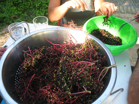 Zuerst streift man die reifen (!), tief dunkelrot bis violetten Beeren mit einer Gabel von den Dolden ab, in unserem Fall ging noch einmal viel Zeit zum Aussortieren der noch grünen Beeren drauf.