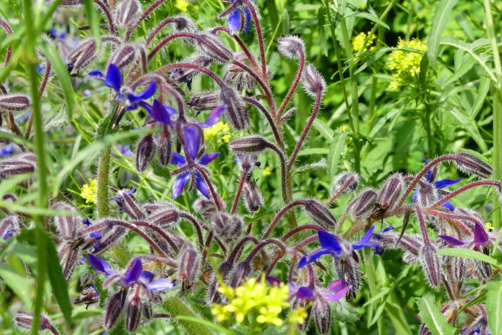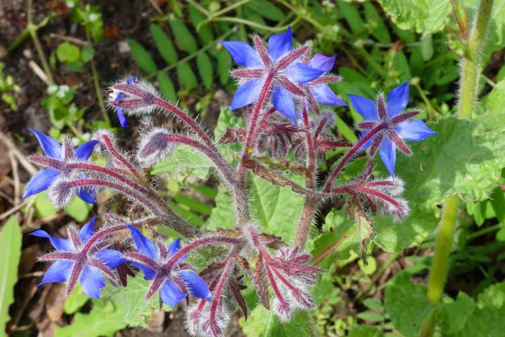 Neu hinzugekommen ist der Borretsch Borgo officinalis, eine Gewürz- und Heilpflanze. Dieses in der Regel einjährige Gewächs hat in den letzten zwei Jahren begonnen, in unserem Garten zu überwintern.