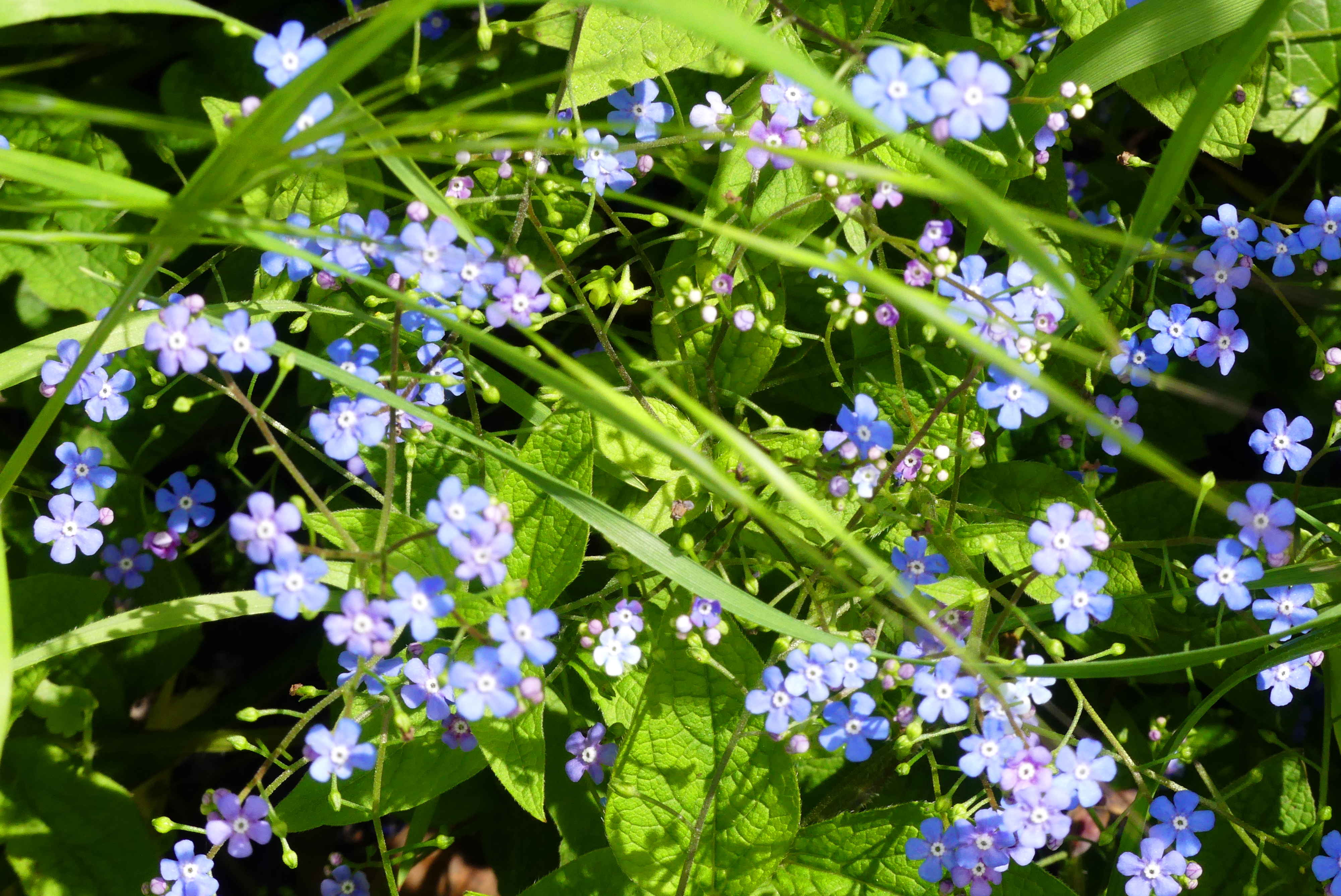 Das feuchtigkeitsliebende Kaukasus-Vergißmeinnicht Brunnera macrophylla, ebenfalls ein früher Nahrungsspender für Insekten, verfügt über den tiefsten Blauton von allen Vergißmeinnicht-Arten und erfreut im Jahreverlauf durch sein sich immer mehr entwickelndes herzförmiges Blattwerk, das einen hübschen Bodendecker auch im Halbschatten abgibt.