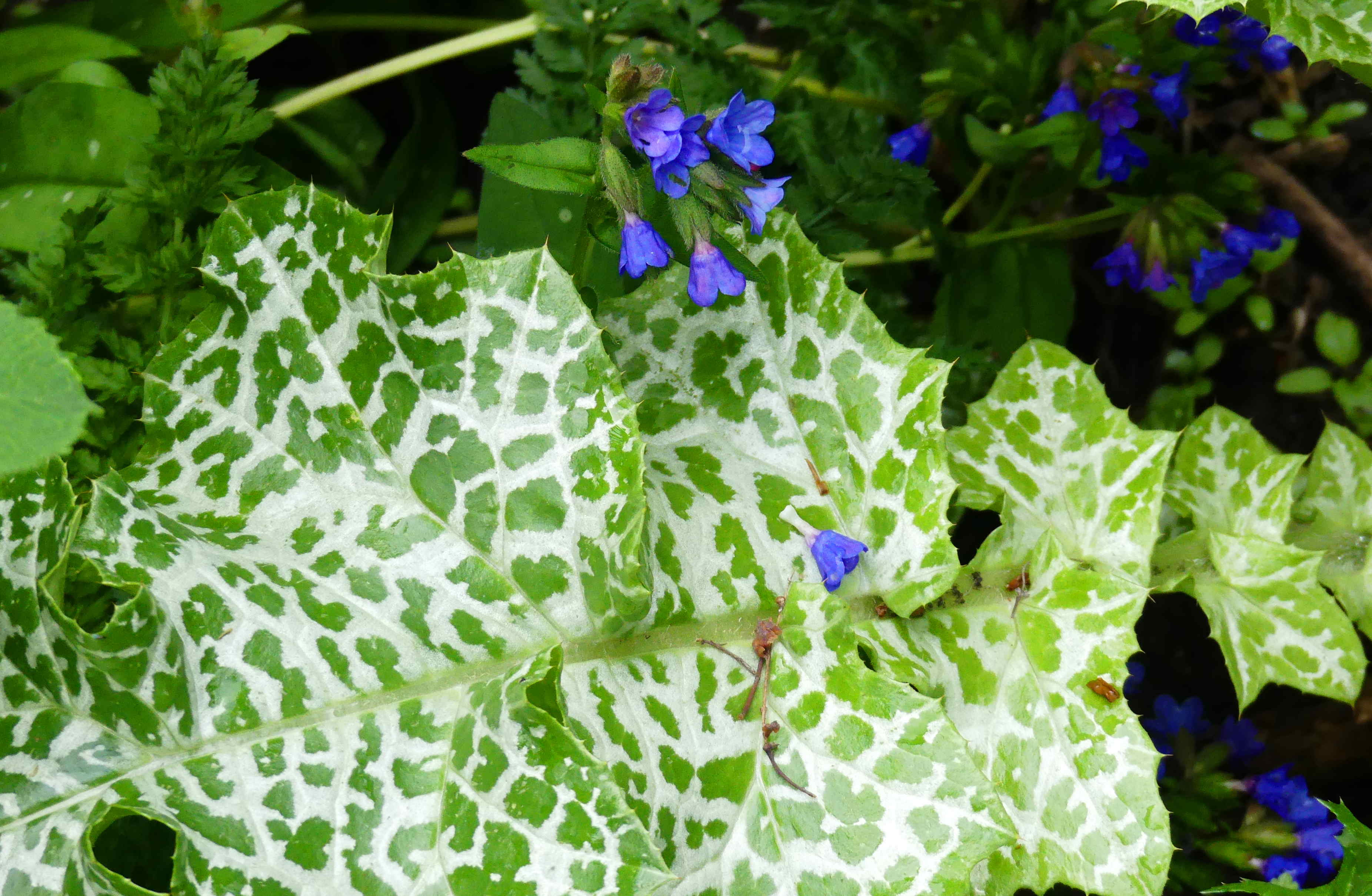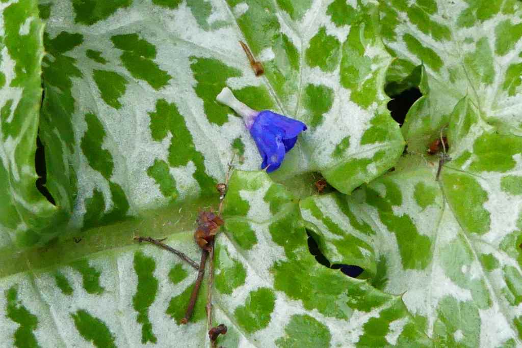 Auch das Lugenkraut Pulmonaria officinalis blüht – nicht nur zu unserer, sondern auch zur Freude der Wildbienen, die es reichlich besuchen – unermüdlich weiter und steht dabei im reizvollen Farbkontrast zum Laub der benachbarten Mariendiestel Silybum marianum.