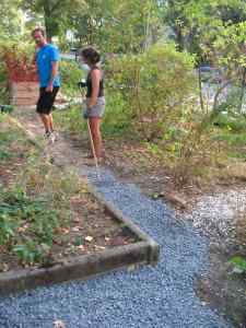 So kamen wir auf die Idee, es mit einer Kiesdecke zu versuchen, die, mit einer darunterliegenden ca. 10 Zentimeter hohen Bodenschicht versehen, nur locker ausgestreut werden sollte, damit Pflanzen sie durchdringen und bewachsen können. Gleichzeitig würde die lockere Kiesdecke auch Schutz und Lebensraum für viele Insektenarten bieten. Gemeinsam mit Mitgärtner*innen, engagiereten Nachbarn aus dem Kiez und Kindergartenkindern und deren Erzieher*innen, die schon lange unseren Garten nutzen, begannen wir, die Fläche vorzubereiten.