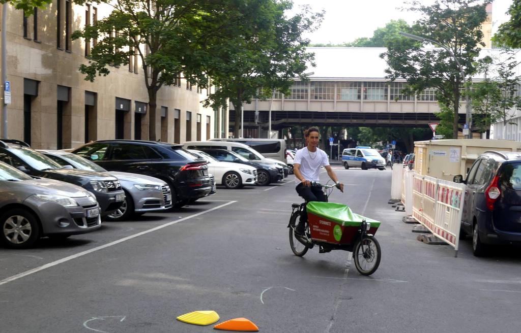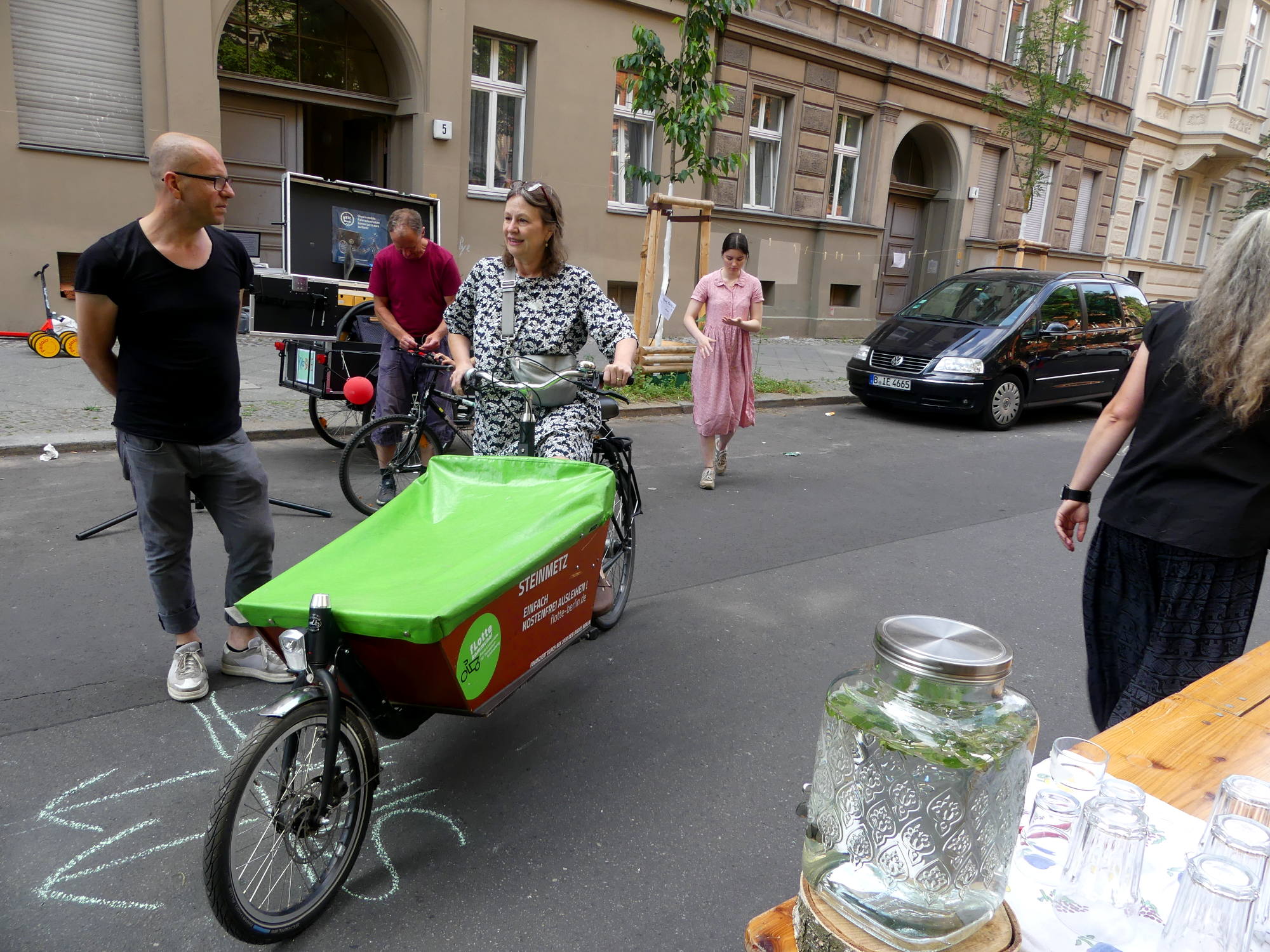 Auch die beiden Herren von den Parkläufern aus dem benachbarten Nelly-Sachs-Park ließen es sich bei ihrem Besuch auf unserem Straßenfest nicht nehmen, das schicke Lastenrad auszuprobieren – was auch sofort filmisch dokumentiert wurde.